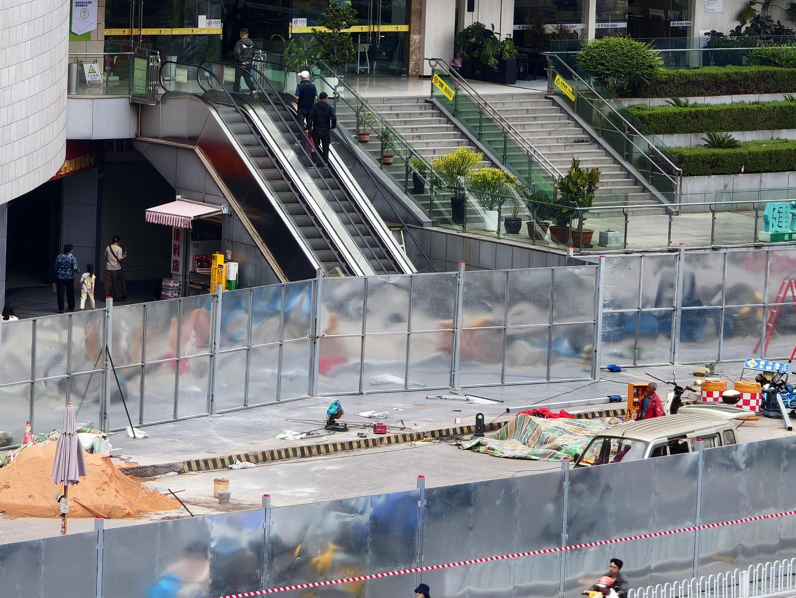 围挡内侧为一处深十余米的下沉式空间,主体结构和墙面装修已基本完工。现场可见自动扶梯、垂直电梯井道贯通至地面,中心设直径约10米的圆形孔洞,扶梯可通往负三层。一辆施工车辆停放在旁,准备安装步行楼梯玻璃挡墙,但当时未见施工人员。