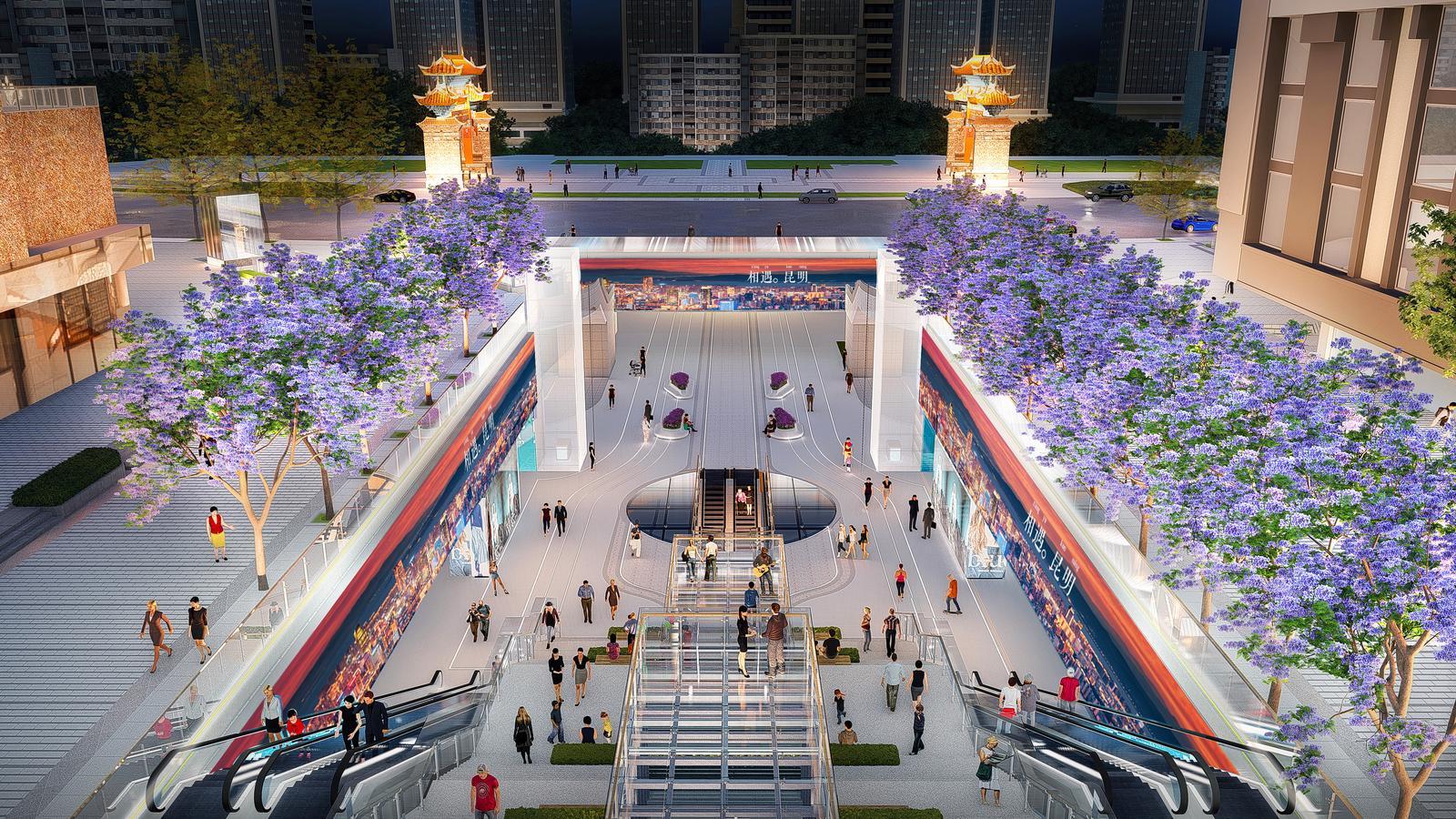 范家宽介绍,现在三市街通往金马碧鸡坊的红绿灯将会取消,行人将从地下通道穿过金碧路,而机动车、非机动车则可在金碧路上实现无障碍通行,有效缓解人车混行的拥堵现状。此外,项目与昆明地铁1号线西北延线金碧广场站无缝接驳,实现了地下商业空间与轨道交通的高效联动。
