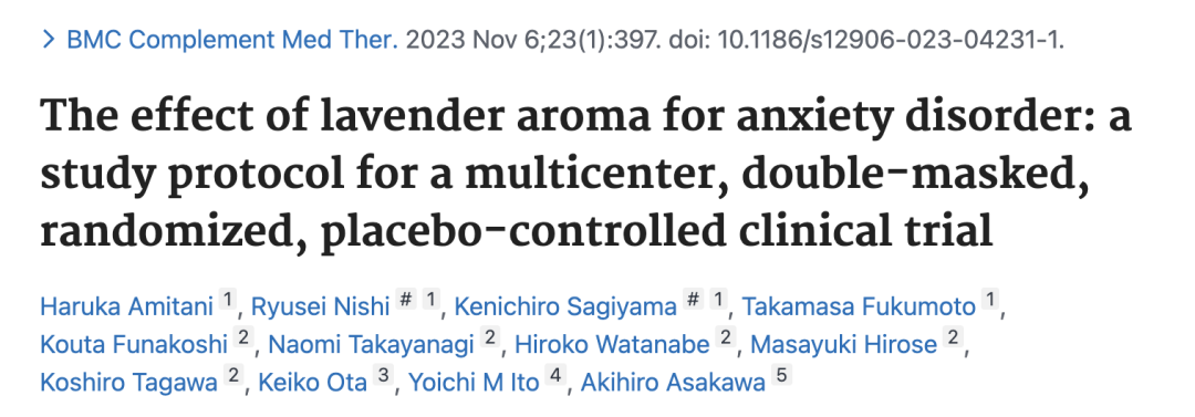 [7] Amitani, H., et al. (2023). The effect of lavender aroma for anxiety disorder: a study protocol for a multicenter, double-masked, randomized, placebo-controlled clinical trial. BMC Complementary Medicine and Therapies, 23(1), 397.