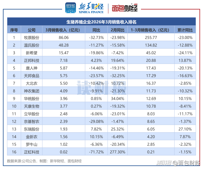 2026年3月,16家上市生猪养殖企业合计销售收入达195.34亿元(傲农生物未披露收入数据)。其中,牧原股份、温氏股份、新希望3月销售收入超过10亿元。