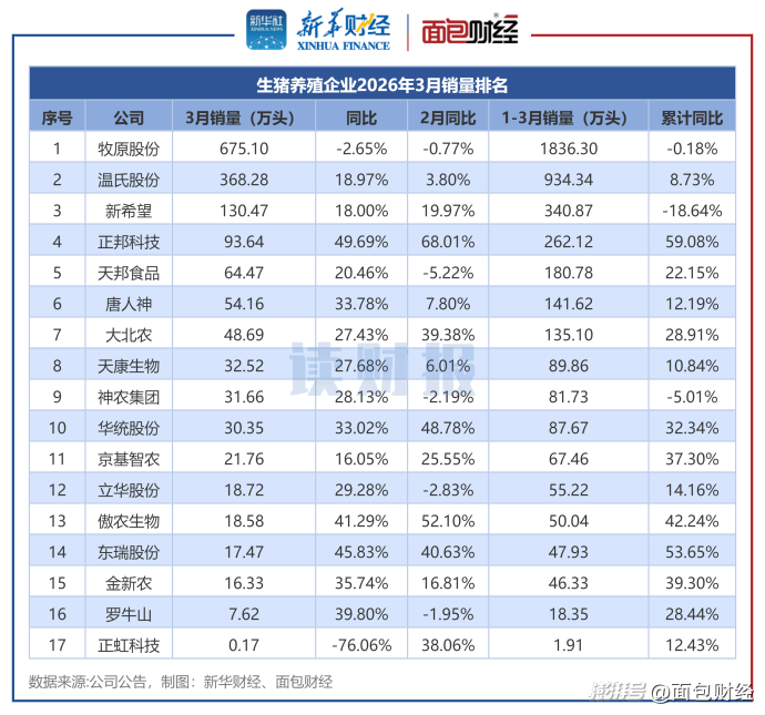 2026年3月,包括傲农生物在内的17家上市生猪养殖企业合计销量达1629.99万头。其中,牧原股份销量超670万头,温氏股份、新希望的销量分别为368.28万头、130.47万头。当月多数企业的销量实现同比正增长,其中正邦科技、东瑞股份、傲农生物的增速超过40%。相比之下,正虹科技、牧原股份出现销量同比下滑。