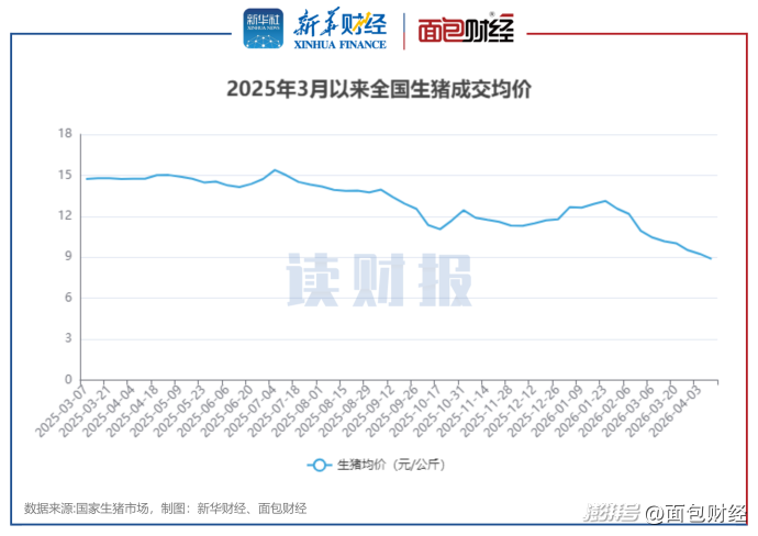 根据国家生猪市场披露的数据,全国生猪成交均价自2026年2月以来出现单边下滑,自3月底生猪成交均价下探至10元/公斤以下,4月初跌至8.88元/公斤,创下近十年新低纪录。
