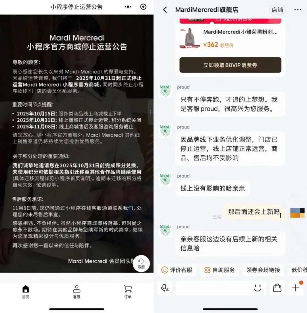 实际上,Mardi Mercredi或将退出中国市场的猜测已经传了很久。2025年10月31日,品牌小程序官方商城宣告停止运营,当时线上旗舰店铺仍正常运营。当年9月开始,该品牌国内多地门店便陆续进入清仓甩货闭店状态。