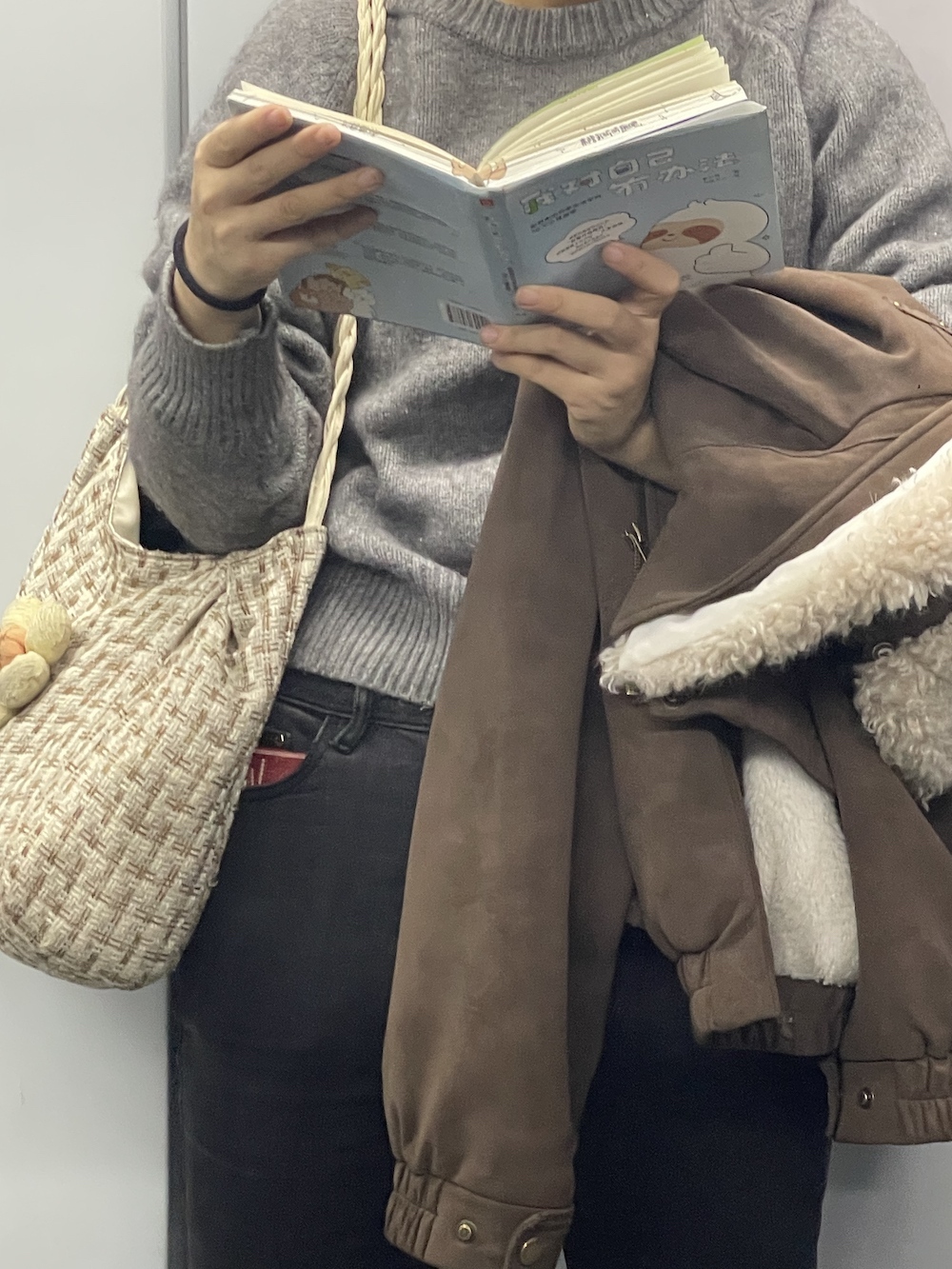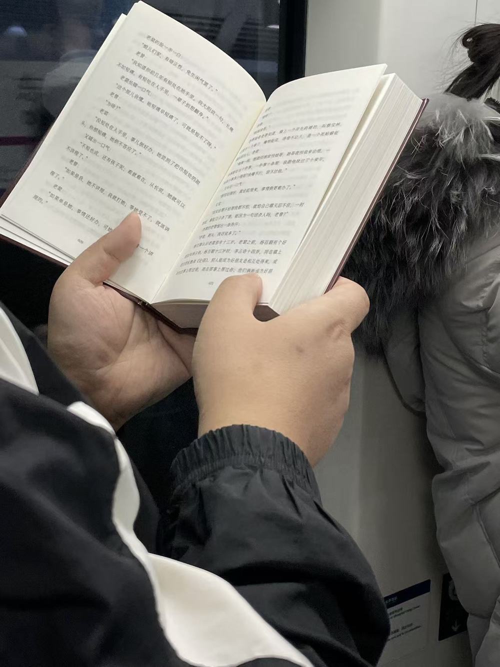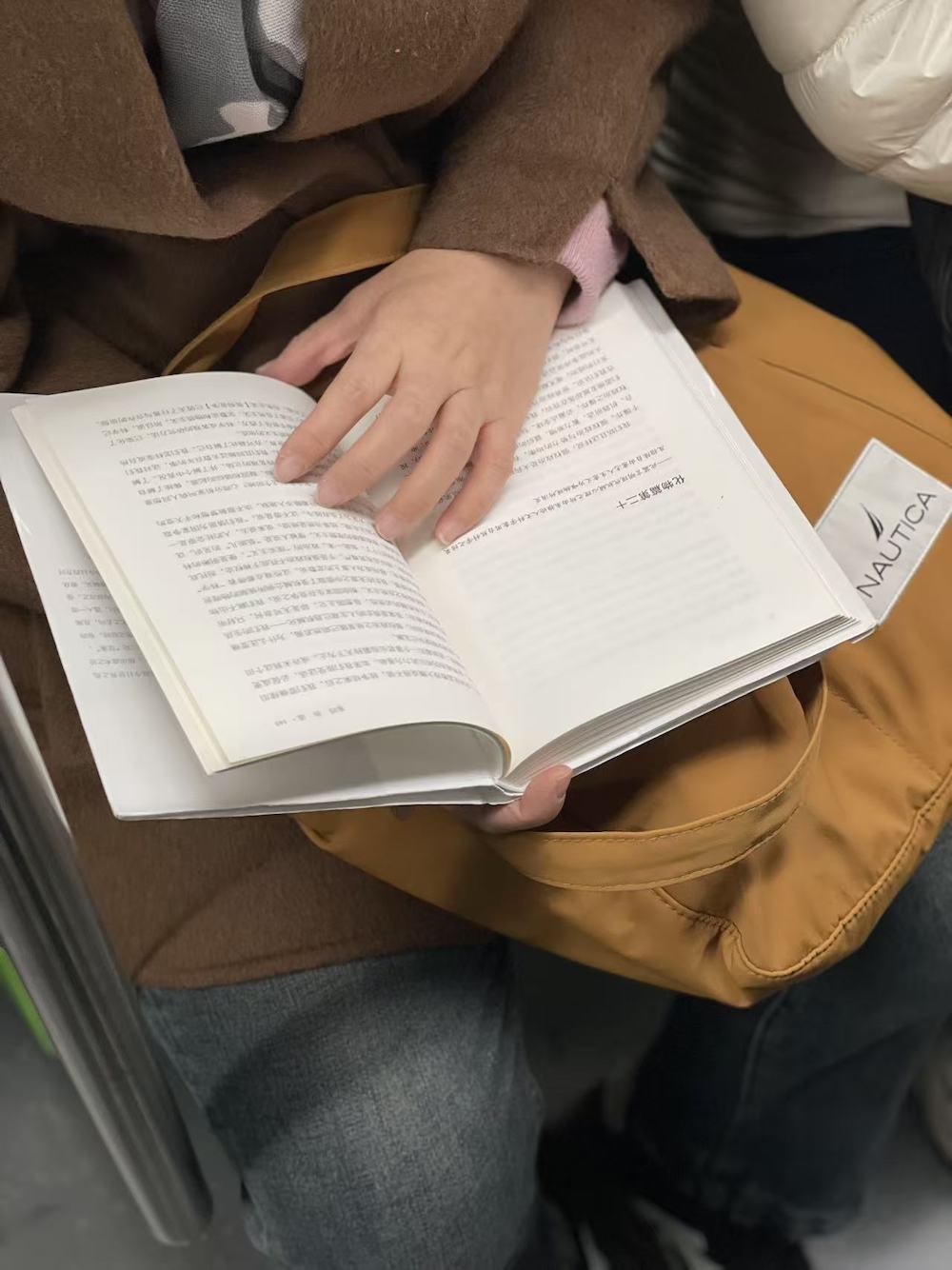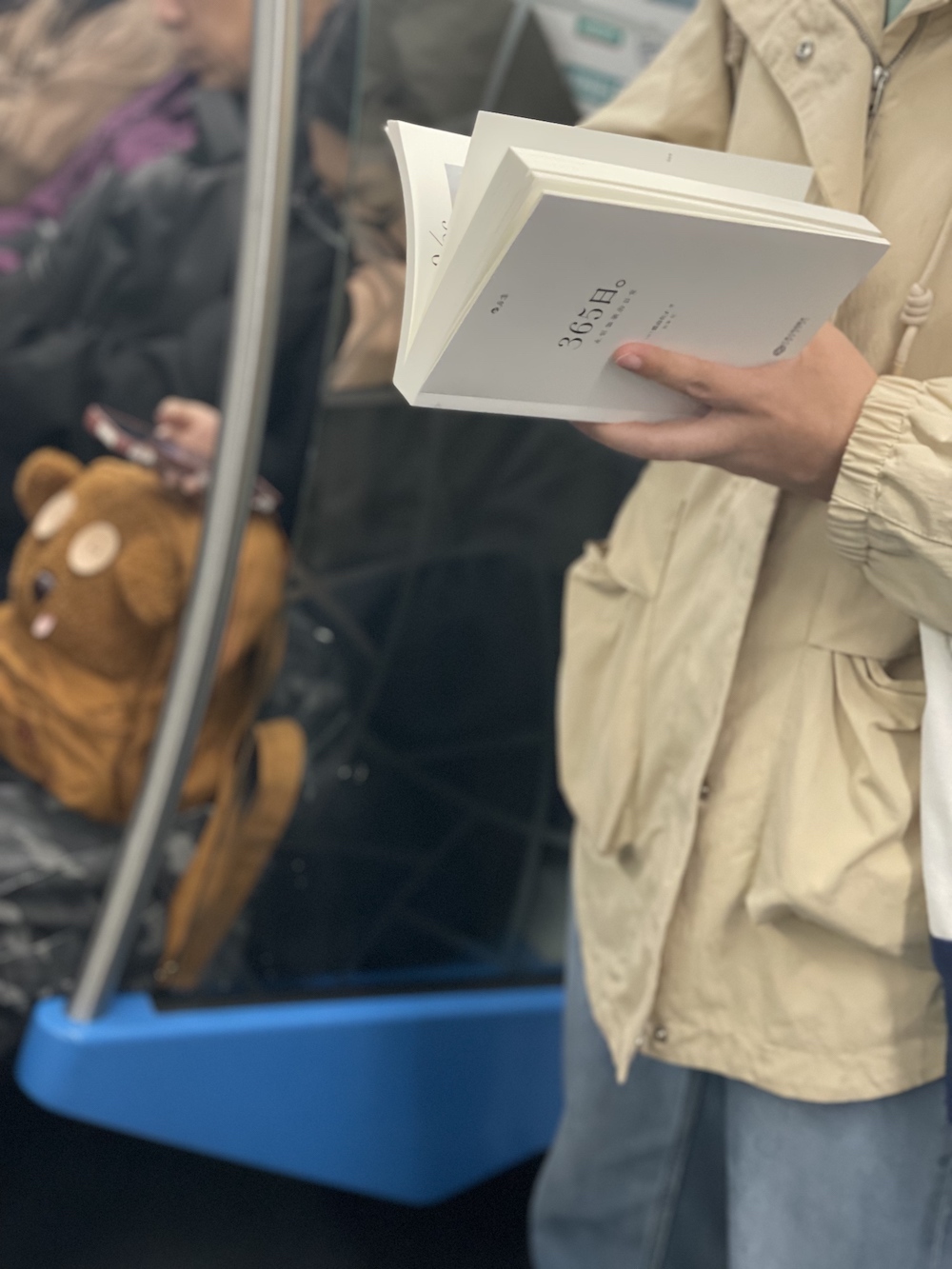 75.2025年11月1日。周末中午。上车后坐了两站,抬头看到有抱孩子的一家上来,让座后去远一点的车厢连接部,然后就看到了读《我对自己有办法》的她。车上一直听播客,几站后发觉有人拍我的肩,是刚才落座的年轻妈妈,她穿过人群来告诉我她们一家要下车了,问我要不要回去坐。