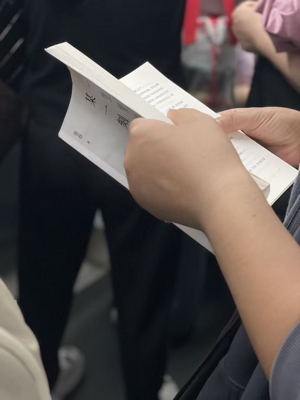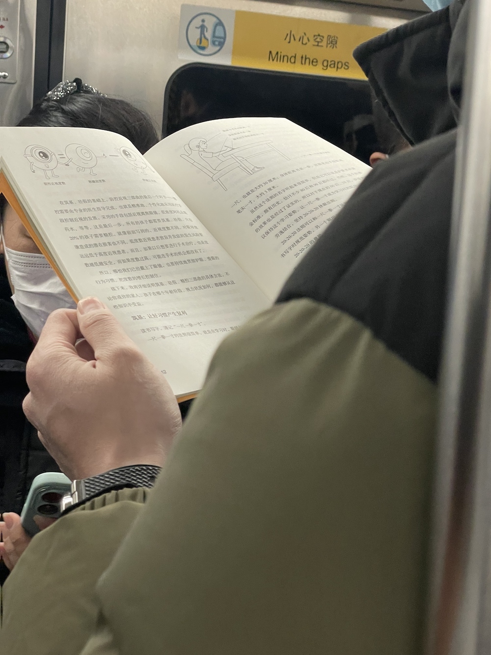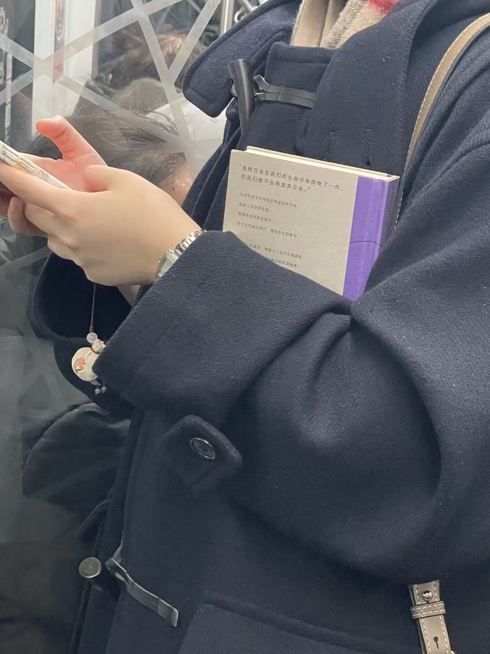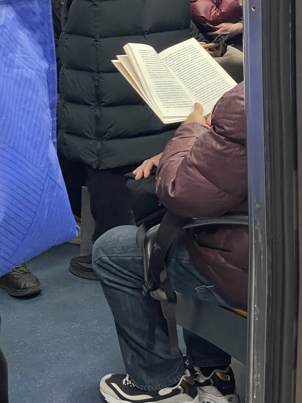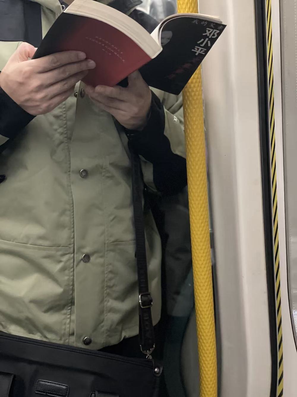 75.2025年11月1日。周末中午。上车后坐了两站,抬头看到有抱孩子的一家上来,让座后去远一点的车厢连接部,然后就看到了读《我对自己有办法》的她。车上一直听播客,几站后发觉有人拍我的肩,是刚才落座的年轻妈妈,她穿过人群来告诉我她们一家要下车了,问我要不要回去坐。