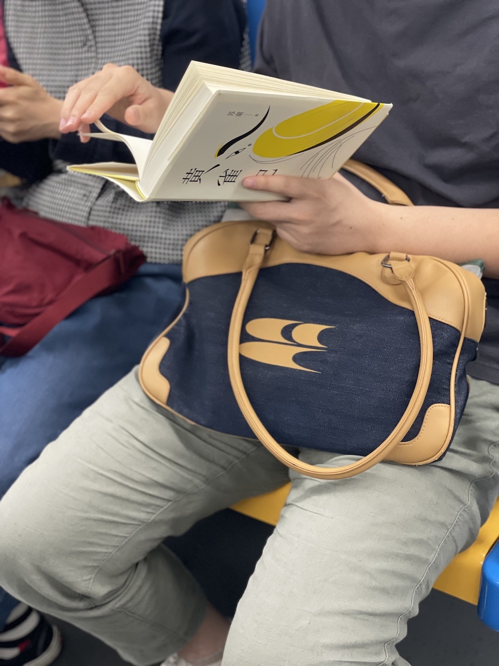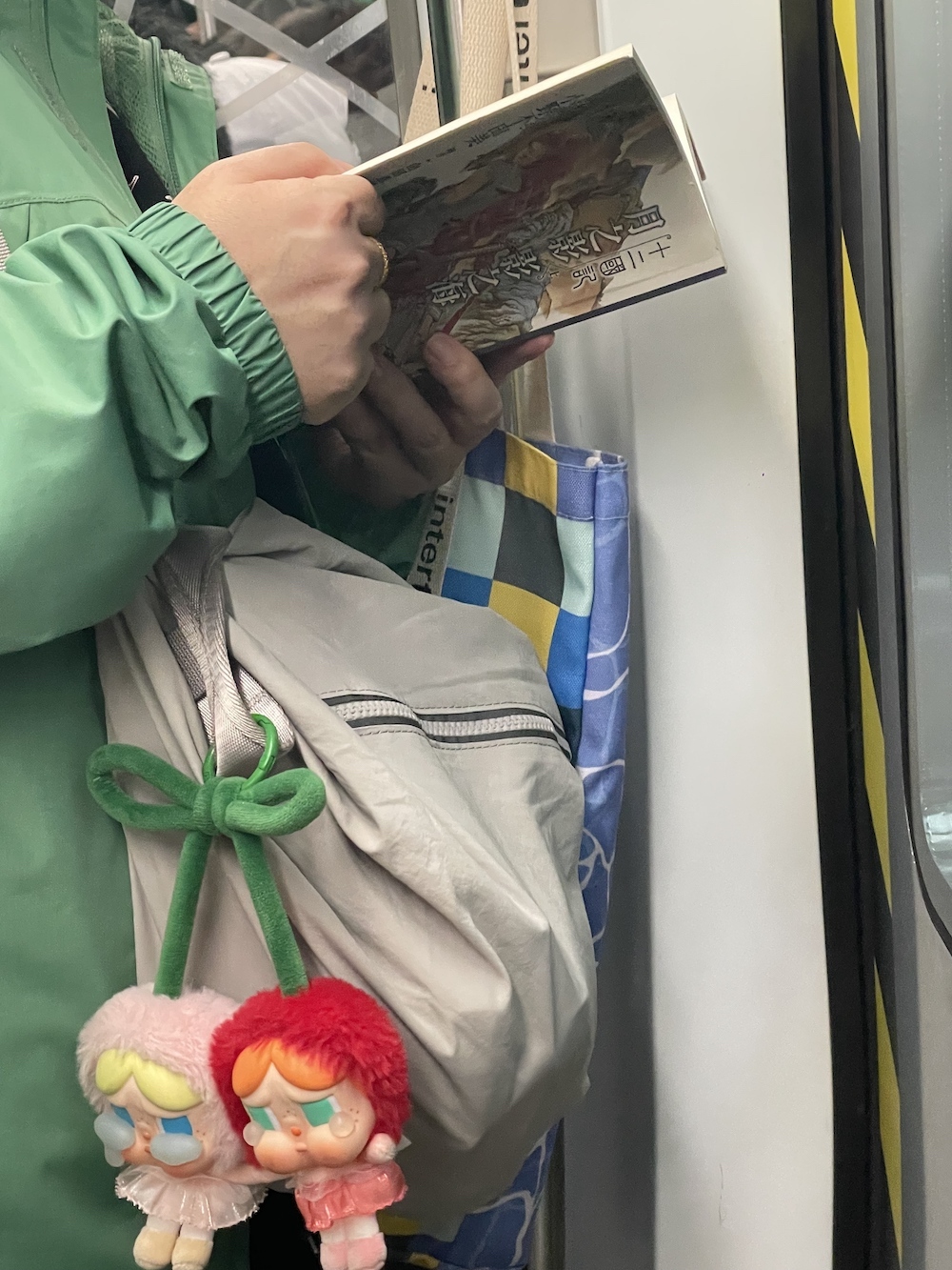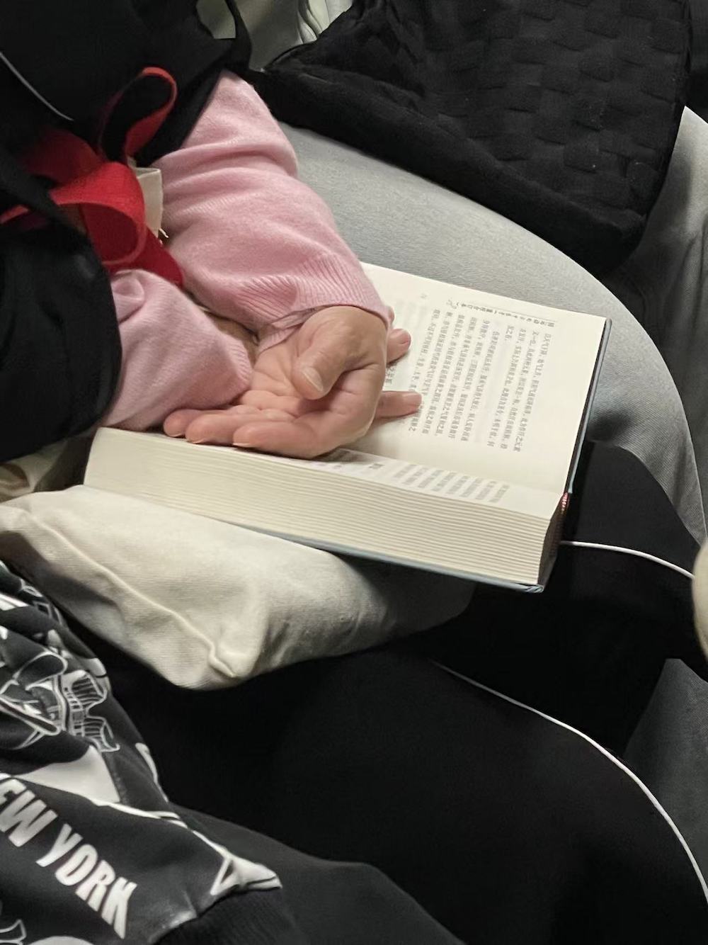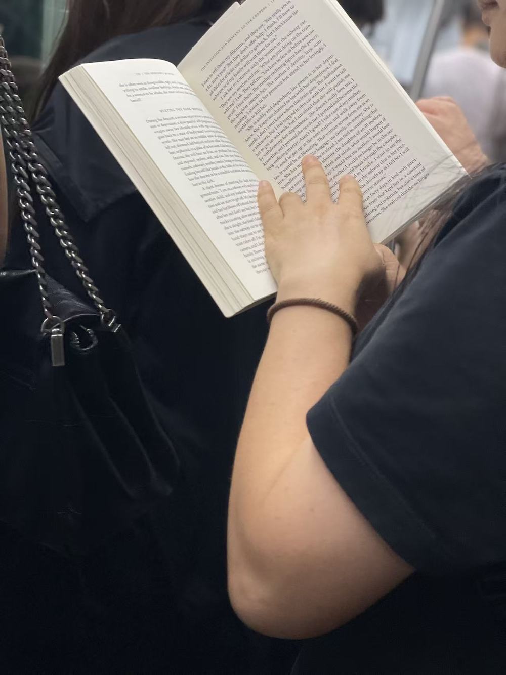 75.2025年11月1日。周末中午。上车后坐了两站,抬头看到有抱孩子的一家上来,让座后去远一点的车厢连接部,然后就看到了读《我对自己有办法》的她。车上一直听播客,几站后发觉有人拍我的肩,是刚才落座的年轻妈妈,她穿过人群来告诉我她们一家要下车了,问我要不要回去坐。
