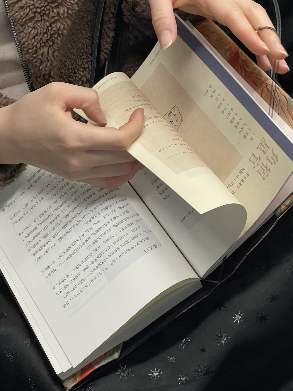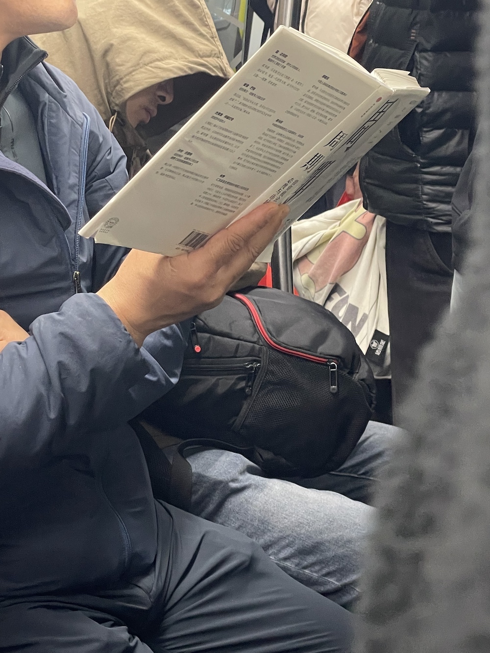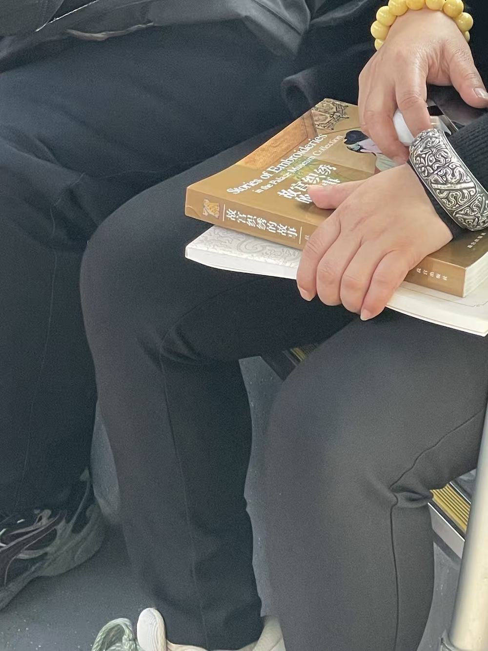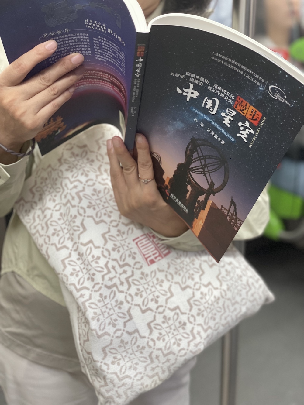 35.2026年3月19日。心里正慨叹最近没怎么遇到地铁读书人,打算打开自己的书来看,上车就看到她,她还给书套上书衣,是《漫步中国星空》,看版式设计,应该是最新的增订版吧。又,整理全年照片时发现2025年8月6日地铁上有人读这本书的前一个版本。