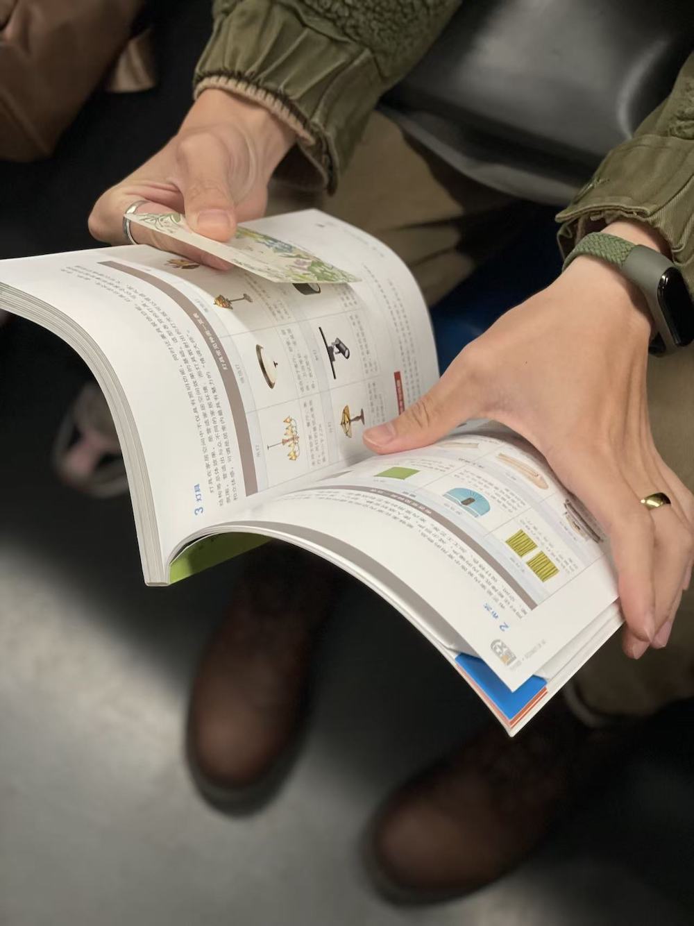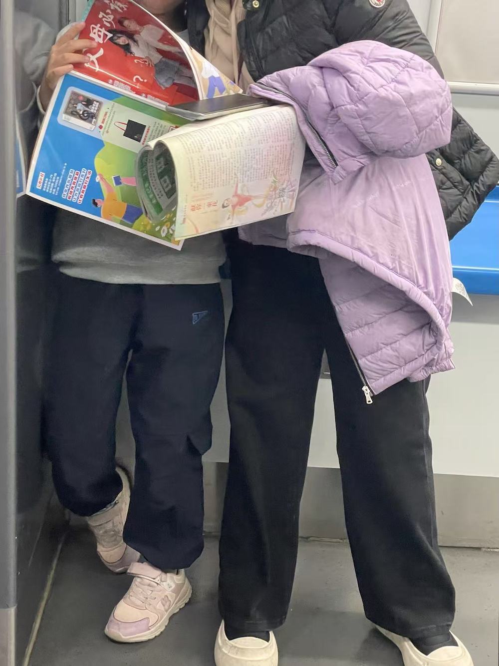 78.2025年11月8日。实际上是一家三口,刚上车时妈妈看《父母必读》,孩子读《意林(少年版)》,爸爸在对面读《三联生活周刊》。换乘后孩子和妈妈交换了读物。