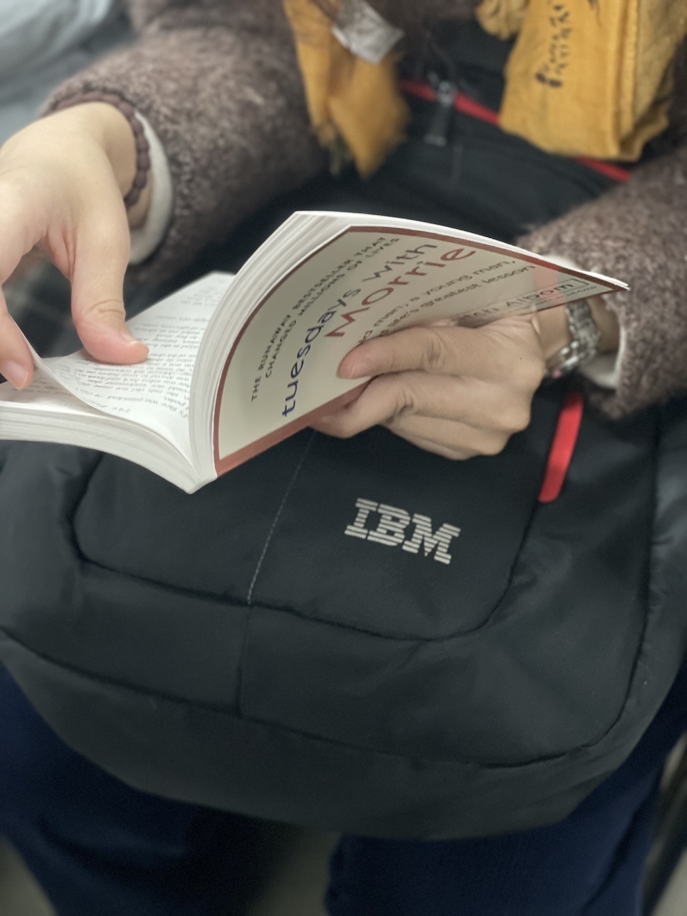 32.2025年10月28日。早上坐过站,往回坐时看到她在读《Tuesday With Morrie》,中文版就是那本《相约星期二》。