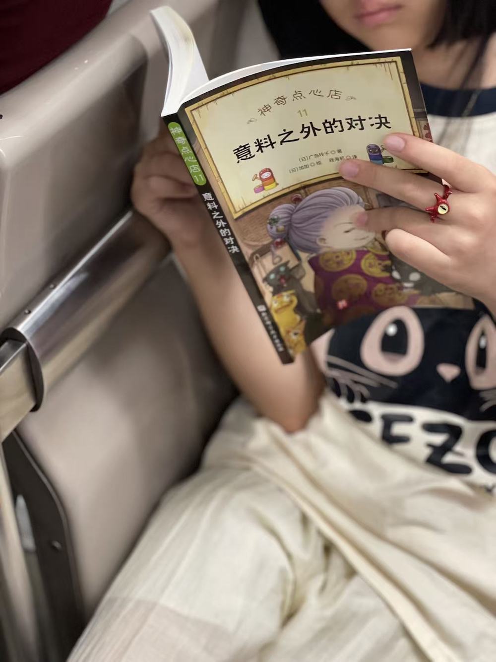 27.2025年7月29日。出差回来后第二天下班路上遇到的小姑娘,拍了忘记发。她读“意料之外的对决”,孩子是读书的重要人群,暑期是读书的重要时段。“神奇点心店”这个系列的书此前也在地铁上遇到过。