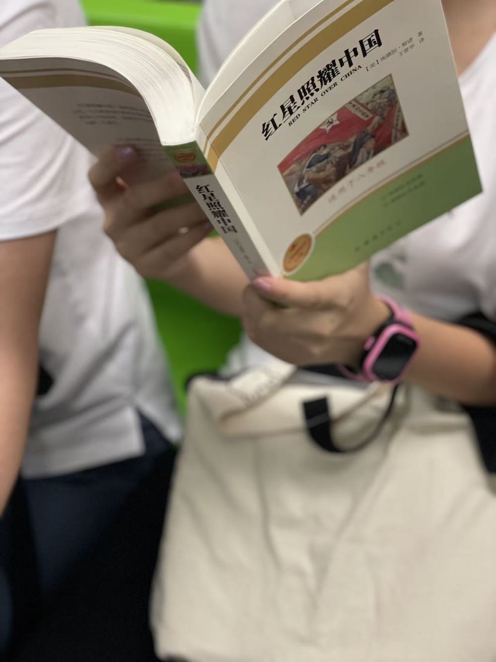 26.2025年7月8日。暑假来临,孩子们又开始旅行了。这是一个提着大大行李箱跟大人一起旅行的小姑娘,她在读《红星照耀中国》。