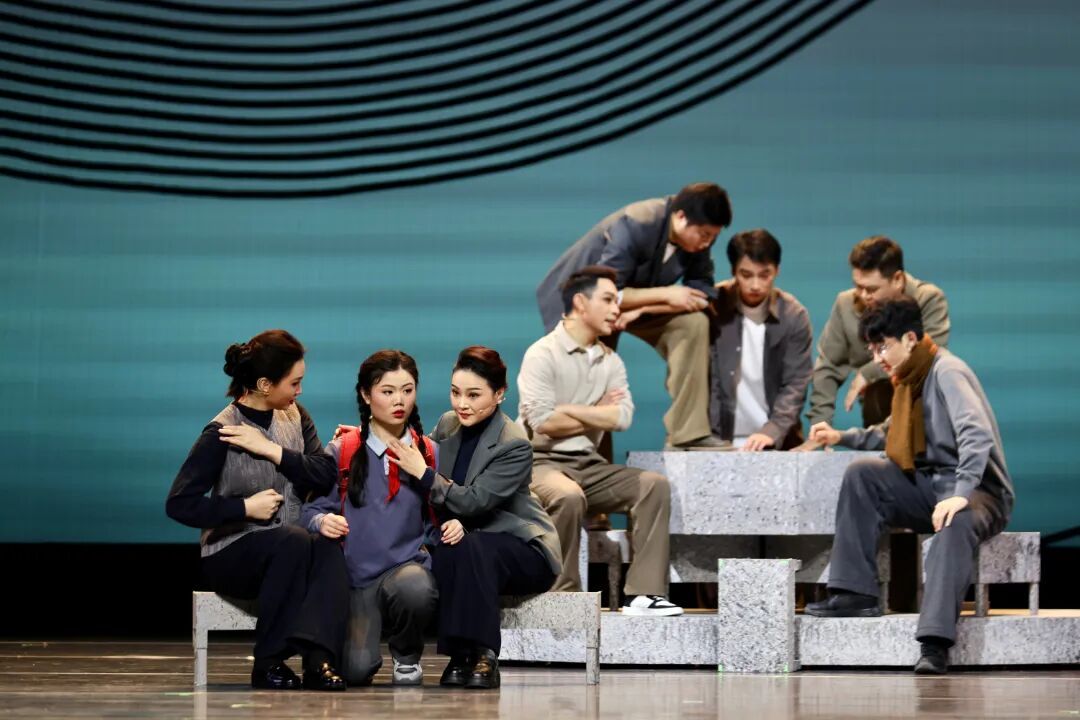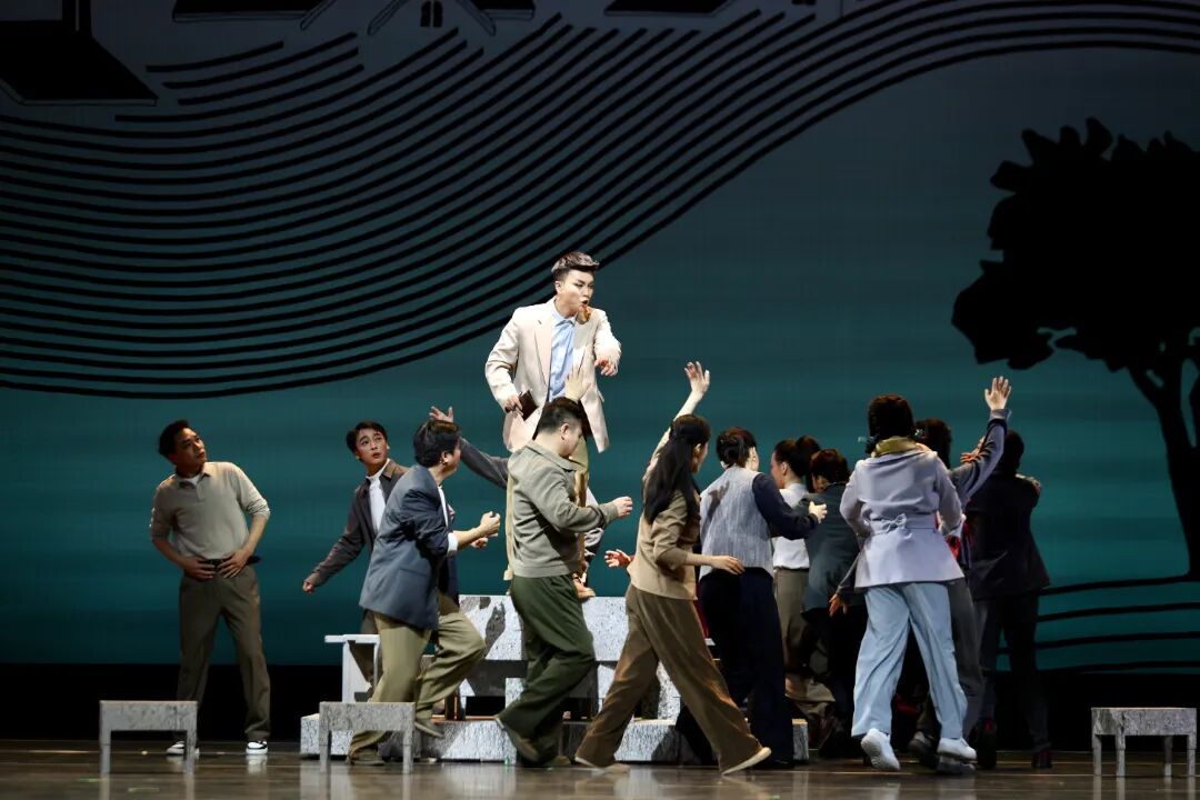 第三层戏剧情境,便是全剧最有时代感的直播间。巨大的手机模型被推到台上,歌队化身网民,龚好张口就是“点点关注”“送出福袋”“3,2,1,上链接”。这个场面如果处理得粗糙,很容易变成对网络景观的照搬。《豆腐书记》可取的地方在于它让直播同时承担两样东西:其一是新鲜感和真正的冲突推进,农产品卖得火爆,豆腐和香米很快售罄,说明直播确实给乡村产业打开了通道;其二是剧中角色借匿名账号抛出“旧情复燃”“为了政绩”这些质疑,公屏瞬间乱起来,网民围观、起哄、追瓜,书记的公共身份与私人历史一起被拖进传播空间。戏到这里,力量一下子起来了。直播不只是卖货场,它还是舆论场、误解场、压力场。人物在网络风口上被看见,也在网络风口上被撕扯。这个场景一立住,乡村新经验就真正进入了戏剧情境。