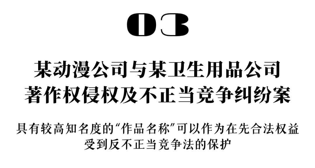 某动漫公司系《熊出没》系列动画视听作品的著作权人,同时拥有熊大、熊二等角色形象美术作品的著作权。某卫生用品公司未经许可,在其生产、销售的纸巾、卷纸等商品上使用熊大、熊二等美术作品和《熊出没》作品名称。法院经审理后认为,某动漫公司案涉作品具有较高知名度,作品名称经作者创造性劳动和大量投入后已经具有明确的指向性,与某动漫公司建立了稳定的对应关系。将作品名称和角色形象用于日常清洁和卫生用品上,属于动画作品常见的衍生应用范围,某卫生用品公司擅自使用上述具有识别作用的卡通形象和作品名称,客观上容易引起公众混淆误认,主观上具有利用作品知名度和影响力牟取商业机会的故意,已构成著作权侵权和不正当竞争,遂判决某卫生用品公司停止侵权,赔偿经济损失和维权费用50万元。