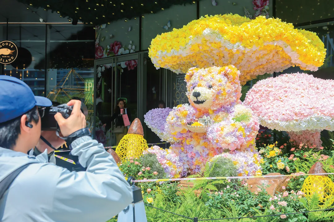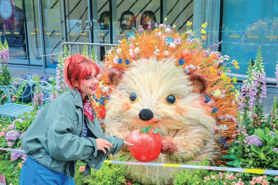 本次花卉节浦东核心赏花区域聚焦前滩,从前滩太古里经钱家滩路到前滩滨江,2公里路线串联起商业街区与滨江绿地,其中1.5公里绣球大道堪称最亮眼景观。蓝紫、粉白、淡青等各色绣球成片绽放,从友城公园一路延伸至月季园,微风拂过,花影轻摇,馥郁花香弥漫街巷。钱家滩路800米限时步行街化身欧式庄园大道,5组蔷薇、玫瑰欧式拱门依次排开,刺猬、长颈鹿、狐狸等花艺小动物沿路相伴,被市民称作“花卉版疯狂动物城”,近30家商户打造的特色花艺门头,每一处都挤满拍照打卡的游客。