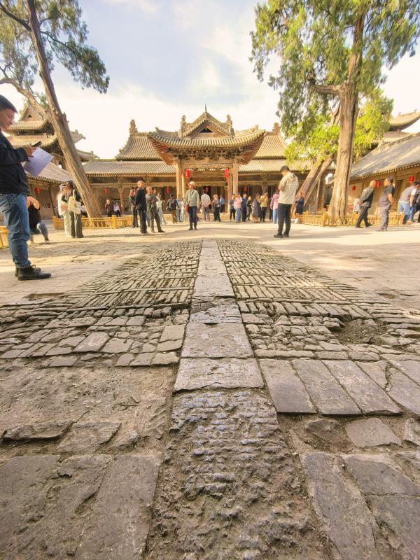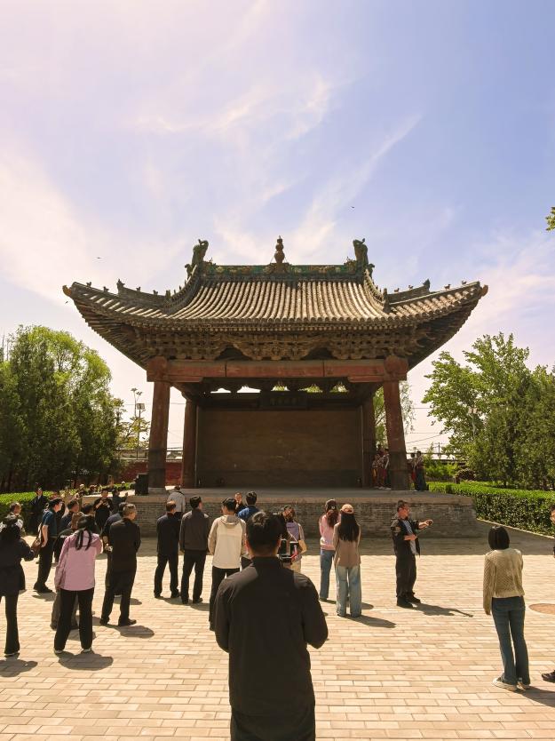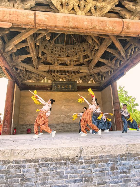 在临汾,采风团还参观了一座特别的戏台——襄汾县汾城古建筑群城隍庙戏台。这座戏台主体建构为明代所建,系重檐歇山顶的过路式戏台,设计独特,上为舞台,下为人行通道,全国重点文物保护单位。其观众区的地面是我国唯一保存较完整的地面铺设,是研究古代戏曲发展的珍贵实物。