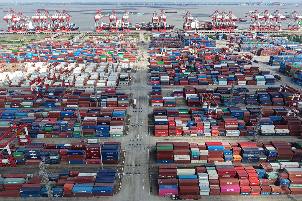 2026年4月14日,上海港集装箱外贸码头车来船往,作业繁忙。视觉中国 图