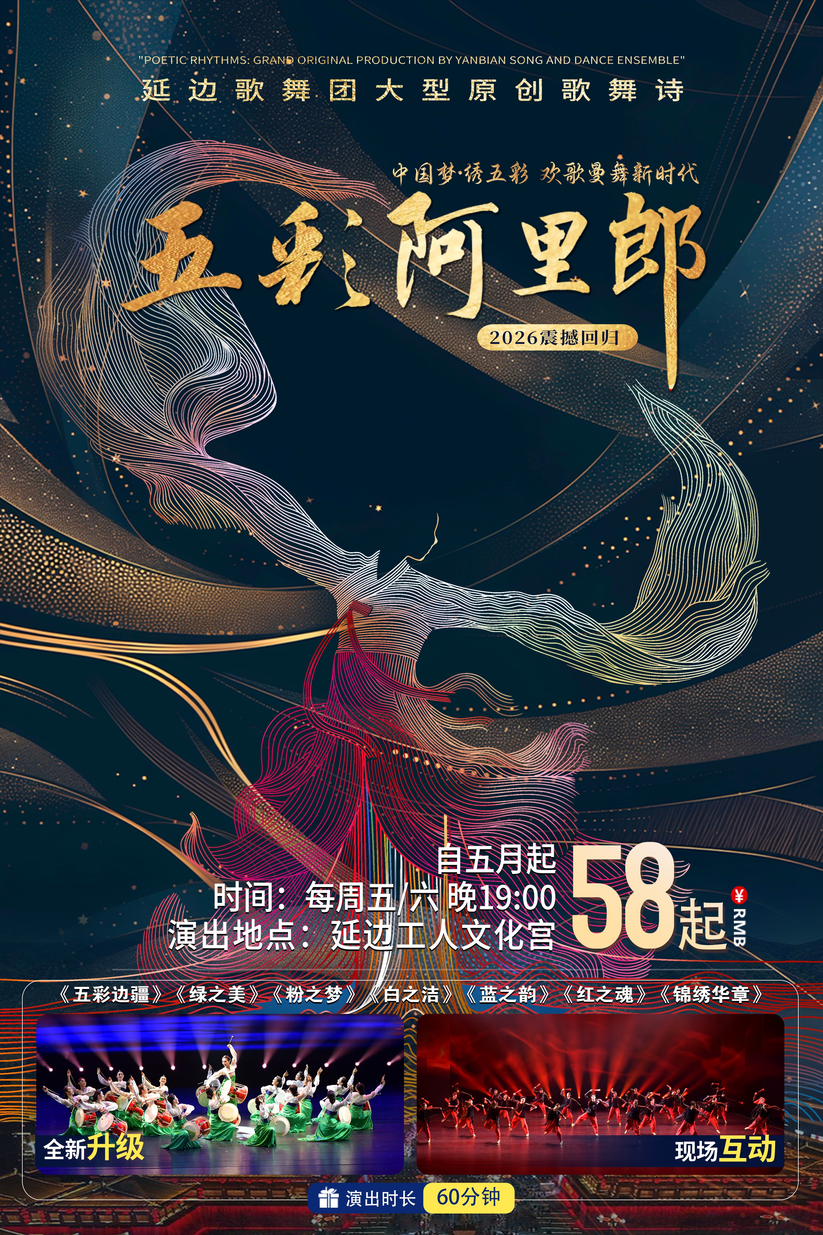 据延边歌舞团相关负责人介绍,《五彩阿里郎》首演定于4月30日(周四)19时。随后,5月1日、2日、3日每晚7时连续加演三场。5月起至10月,延边歌舞团将启动常态化演出模式,每周五、周六晚7时为固定演出场次。此外,剧团将结合法定节假日、旅游旺季及现场客流实际情况,适时适当增加演出场次,切实提升文旅活动品质与群众获得感。票务信息将通过“延边歌舞团”官方微信公众号及合作票务平台陆续发布。