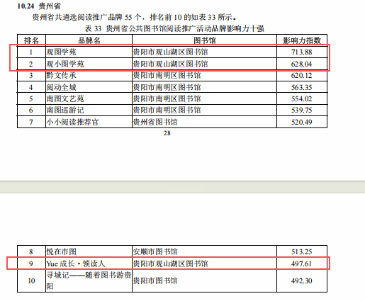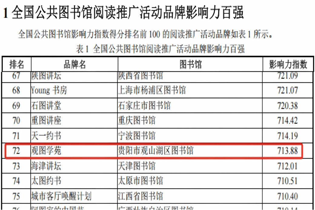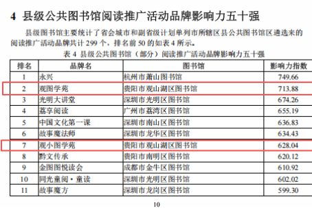 “贵州省公共图书馆阅读推广活动品牌影响力十强”,“观图学苑”排名第1、“观小图学苑”排名第2、“Yue 成长·领读人”排名第9