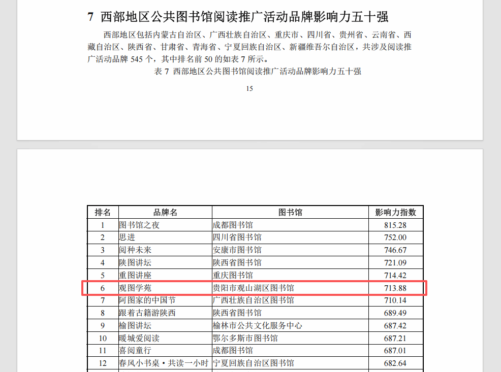 “西部地区公共图书馆阅读推广活动品牌影响力五十强”排名第6