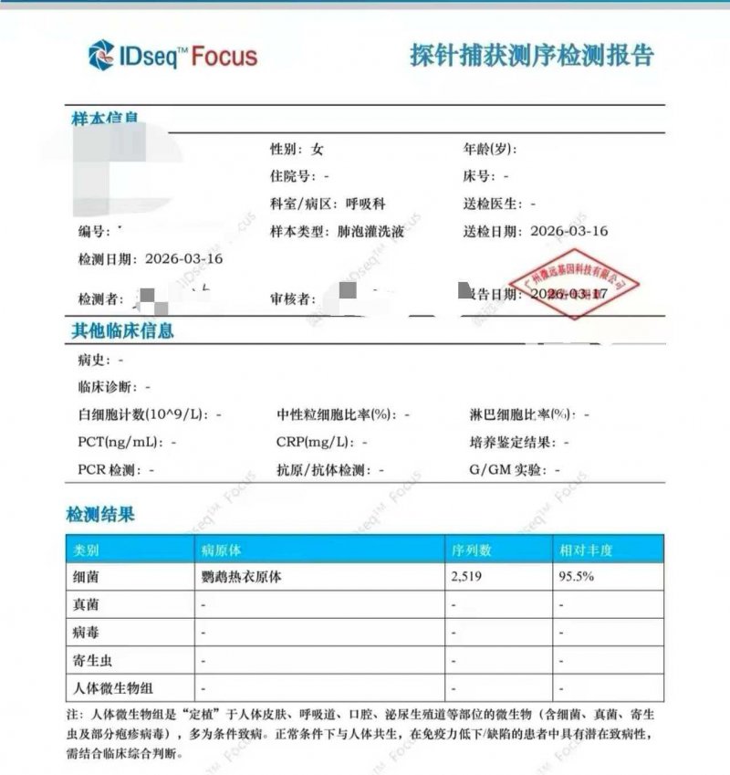 住院后,陈女士体温最高升到了40℃,并出现视物模糊、剧烈头痛等症状。“当时医生就问过家里是不是养鸟,怀疑感染了‘鹦鹉热’。后来经过肺泡灌洗液检测,确认病原体为‘鹦鹉热衣原体’。”李先生说,家里养鹦鹉时,妻子和孩子都会让鹦鹉站在手指上喂食,但平时都是由妻子来收拾鸟笼、处理鹦鹉粪便的。