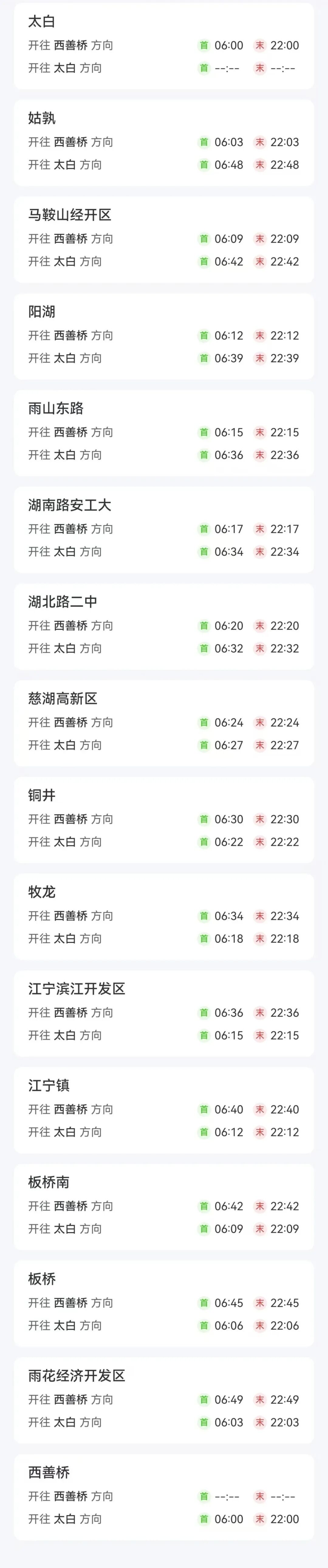 全线16站首末班车时刻表