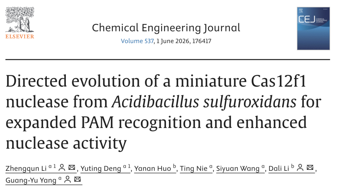 近日,上海交通大学生命科学技术学院杨广宇研究员团队联合华东师范大学生命科学学院李大力研究员团队,在 Chemical Engineering Journal 期刊发表题为:Directed evolution of a miniature Cas12f1 nuclease from Acidibacillus sulfuroxidans for expanded PAM recognition and enhanced nuclease activity 的研究论文。