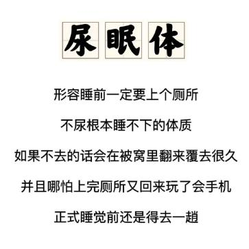 其实「尿眠体」并不是医学名词,只是网友们对「睡前必须排尿,否则无法入睡」这种状态的形象说法。