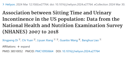 [6] Di X, Yuan C, Xiang L, Wang G, Liao B. Association between Sitting Time and Urinary Incontinence in the US population: Data from the National Health and Nutrition Examination Survey (NHANES) 2007 to 2018. Heliyon. 2024 Mar 12;10(6):e27764. doi: 10.1016/j.heliyon.2024.e27764. PMID: 38510052; PMCID: PMC10950664.