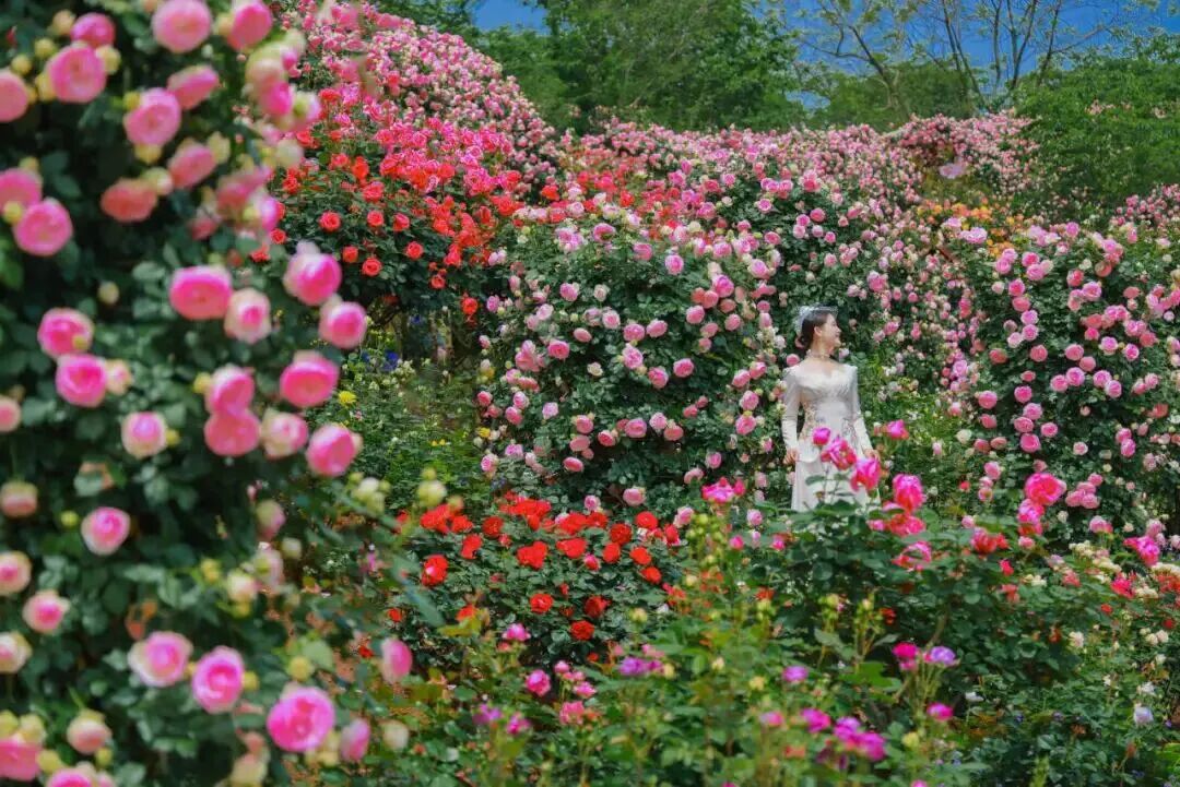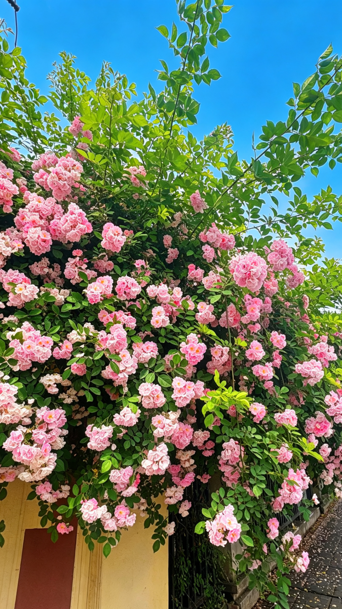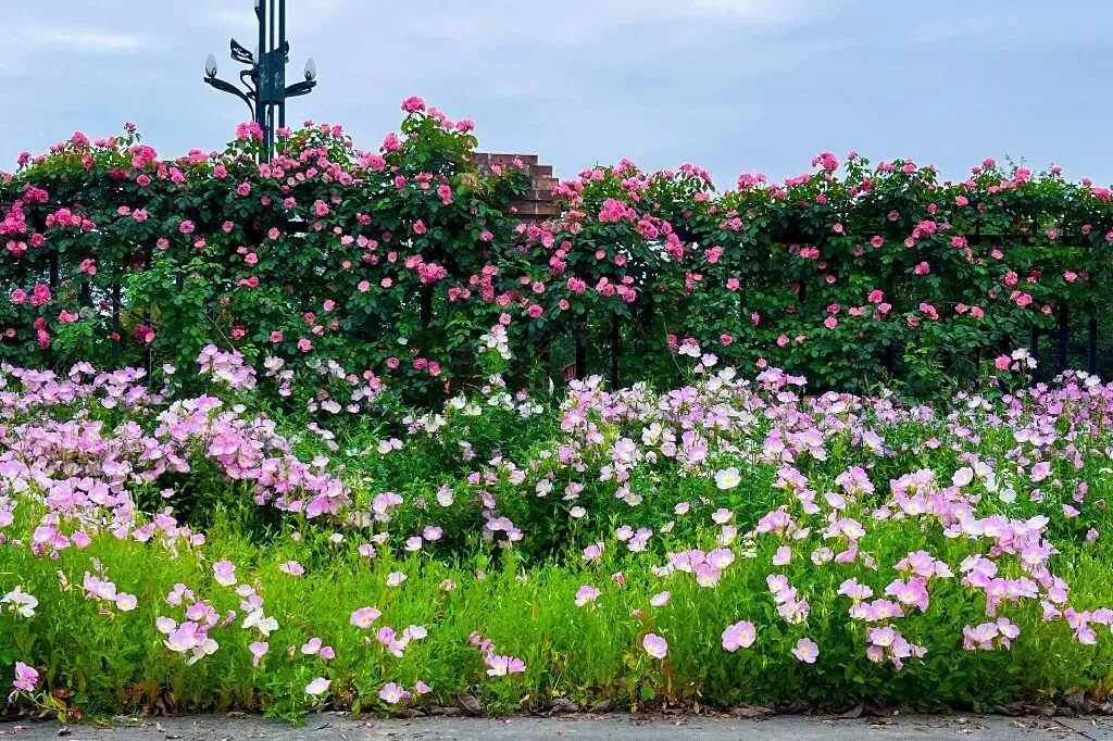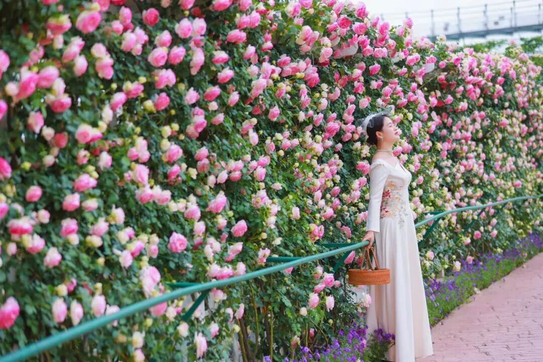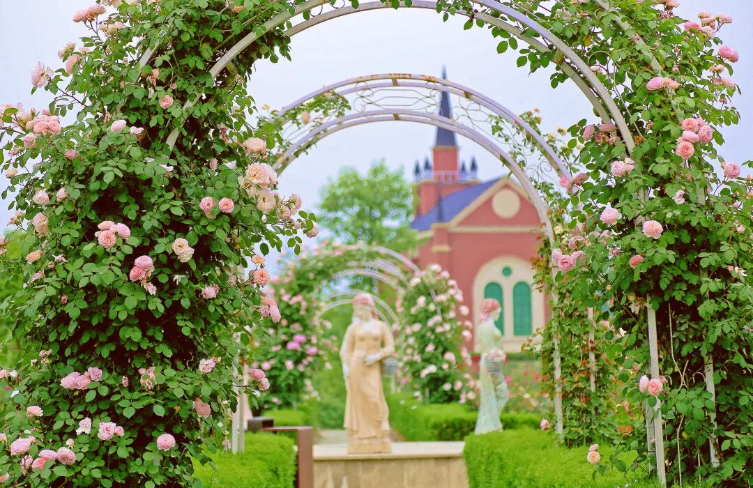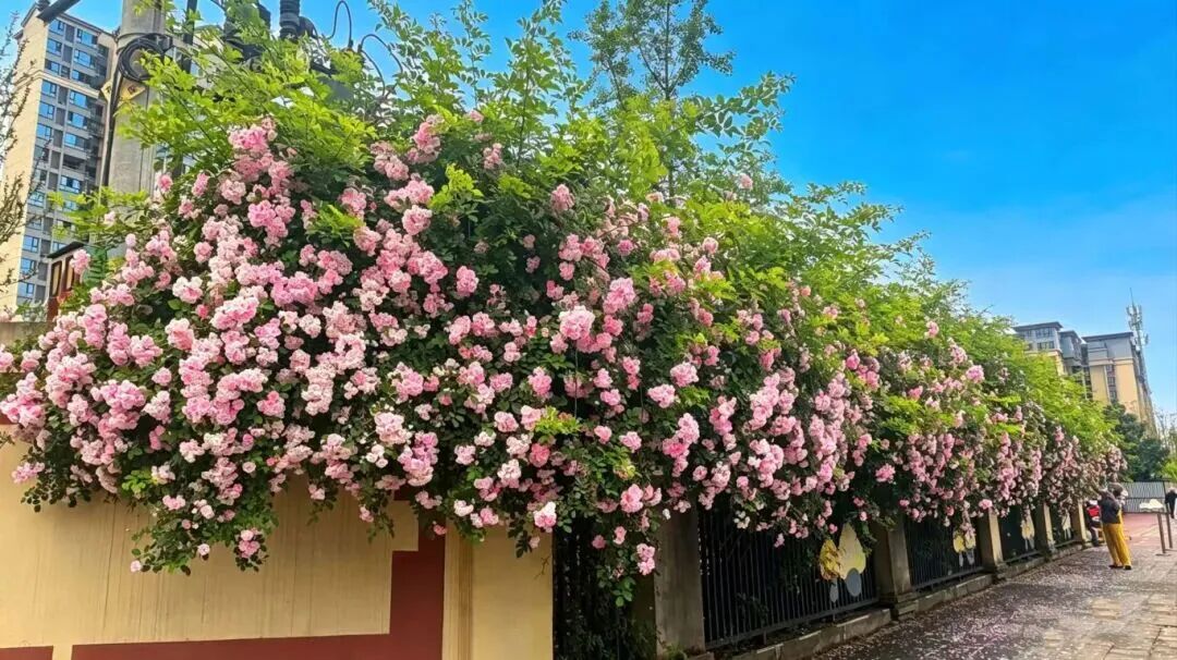 数百米蔷薇花藤缠绕着铁艺栅栏