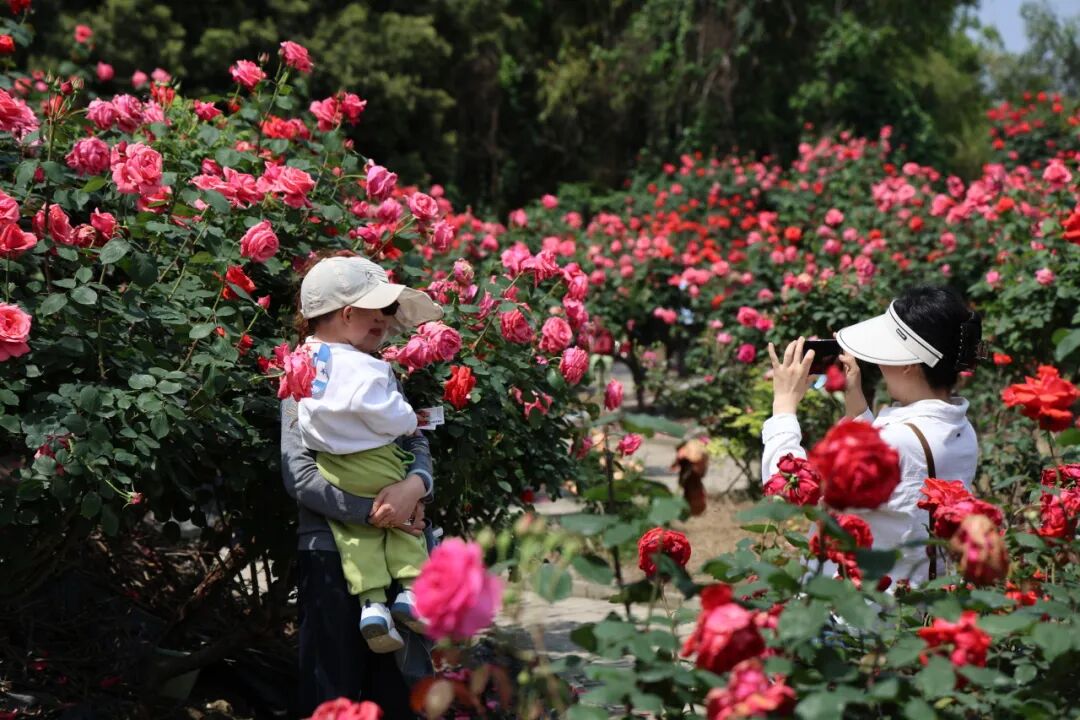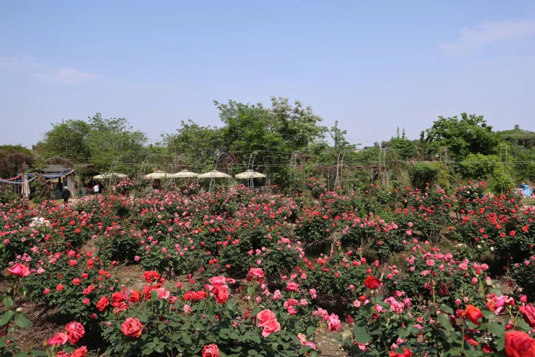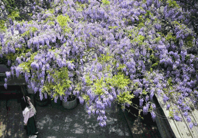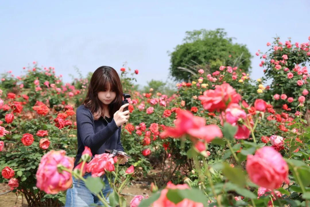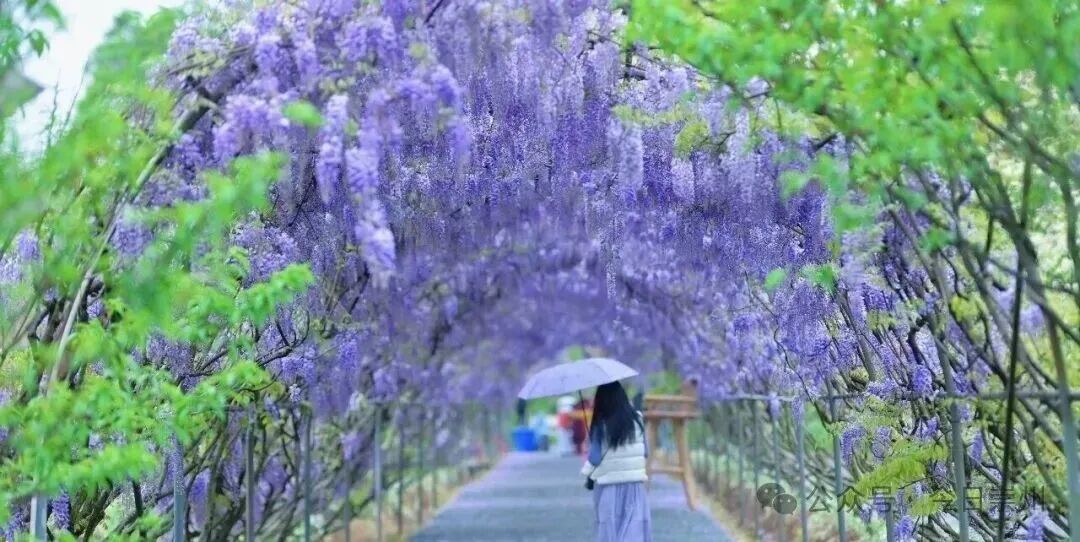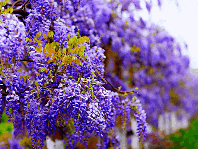 数百米蔷薇花藤缠绕着铁艺栅栏