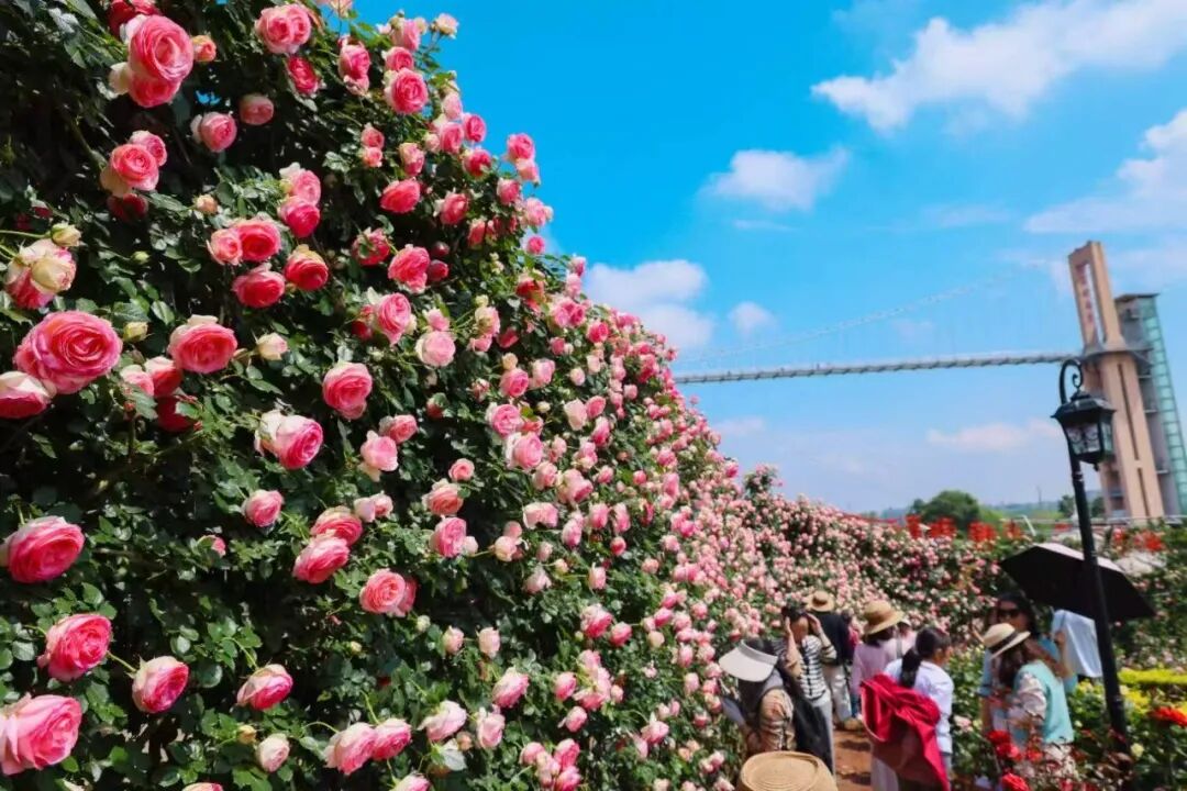 上万片玫瑰花瓣从网红玻璃桥唯美飘落