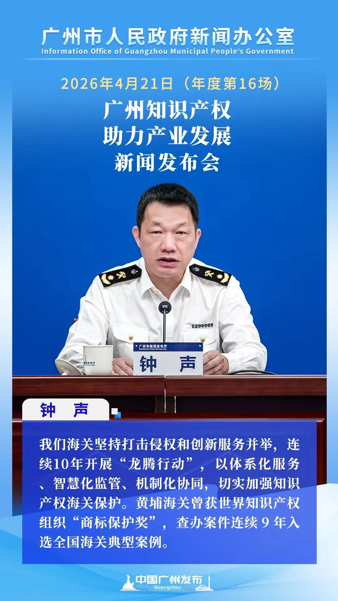 当前,广州企业出海正从“制造”向“创造”转型,为助力更多自主创新企业扬帆“出海”,黄埔海关副关长钟声表示,黄埔海关坚持打击侵权与创新服务并举,连续 10 年开展“龙腾行动”,以体系化服务、智慧化监管、机制化协同强化知识产权海关保护。