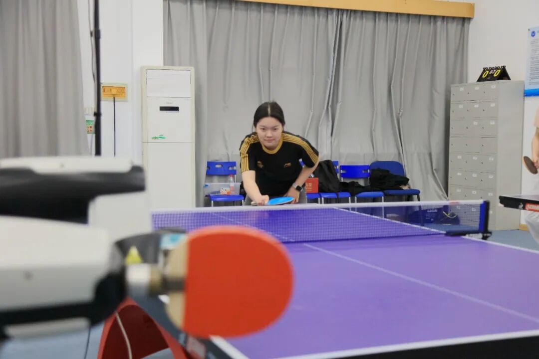 乒乓球室里,银球在球台两端飞速穿梭,划出一道道优美的弧线。队员们两两一组、挥拍对练,推挡、提拉、扣杀,清脆的击球声此起彼伏。而在一旁的球台上,一场“人机对练”正在进行——大家轮番与一台智能乒乓球机器人展开较量。