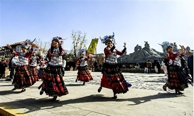 2026年春节期间,在位于陕西宝鸡岐山县水城·三国小镇内,演员们表演苗族舞蹈《酒歌唱起来》。
