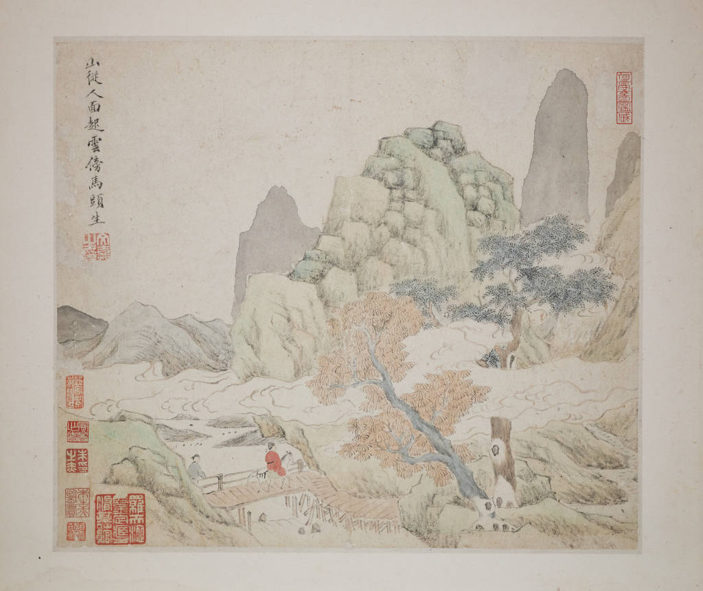 明代文徵明次子文嘉的《山水图》是这一美学追求的典型。画面中,一红衣高士骑白马,悠然行于溪桥之上,周围云烟缭绕,远山如黛。画面上方,画家自题唐代李白诗句“山从人面起,云傍马头生”。
