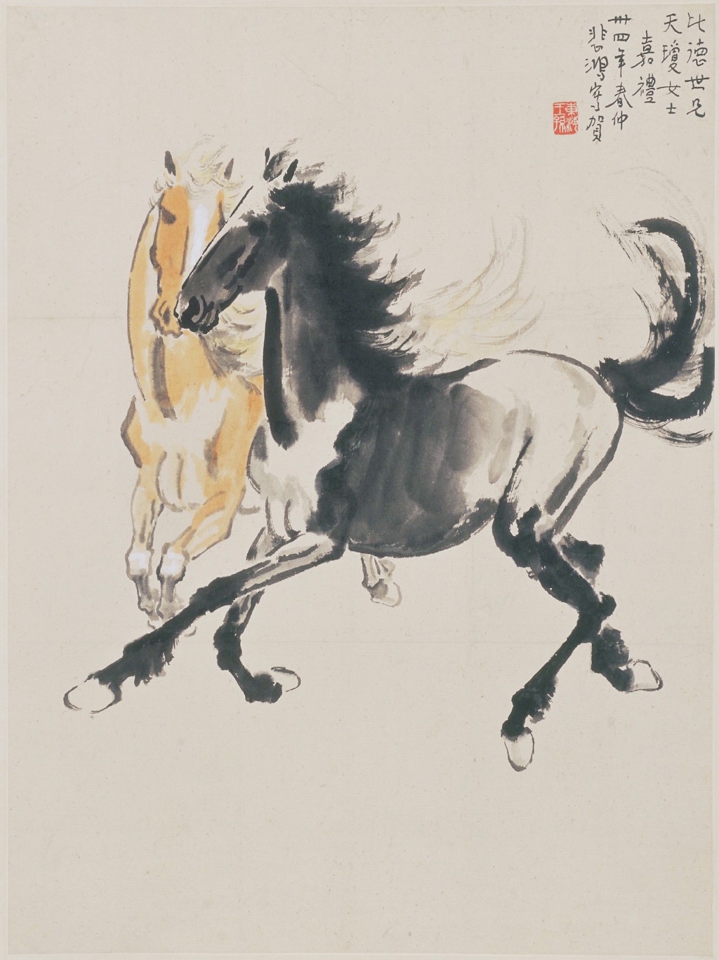 与之形成鲜明对比的,是近现代美术名家徐悲鸿的《双马图》。这幅1945年赠友人的新婚贺礼,是其艺术风格成熟期的代表作。画中两匹骏马并辔奔腾,墨色淋漓,笔力雄健。徐悲鸿早年留学欧洲,深研解剖与素描,归国后将这些科学观察融入大写意笔墨。画中之马,结构精准无比,动势雷霆万钧,充满了不可遏制的生命力与昂扬斗志。