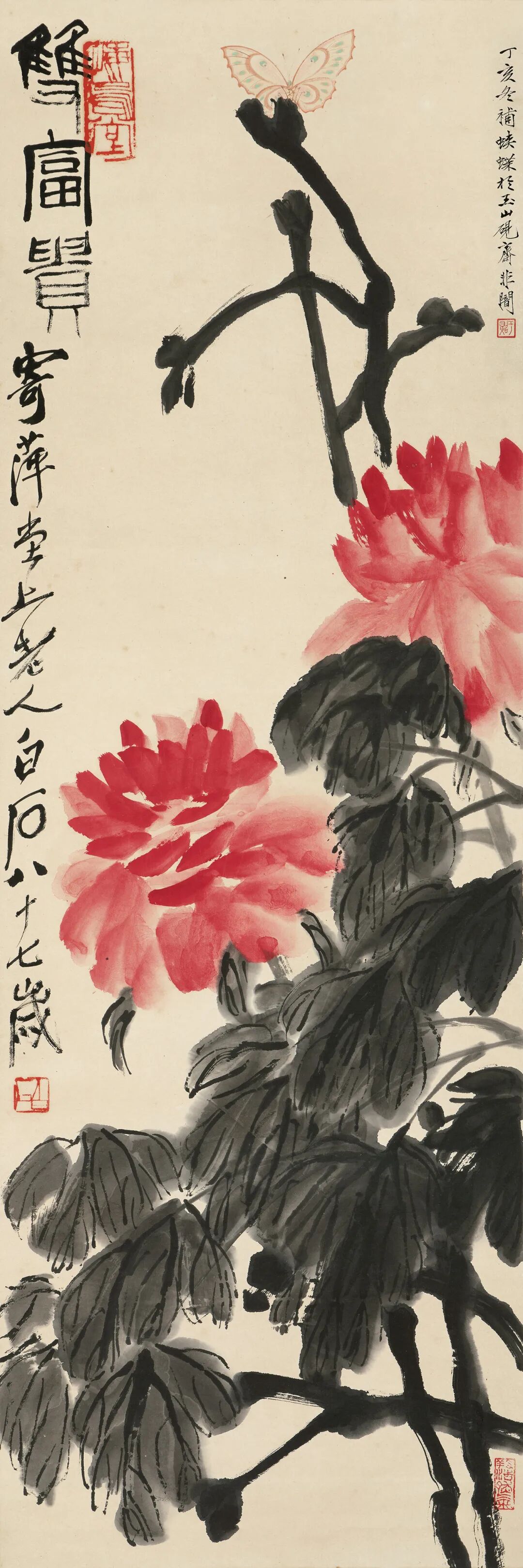此外,荷兰私人旧藏的齐白石、于非闇《双富贵》堪称妙作。1947年二人巅峰时期合作,齐白石以墨笔红花写牡丹,于非闇后添正面工笔蝴蝶,金粉点缀的双翅与白石画风形成呼应,而这种 “藏家促成的合作” 在二人作品中极为罕见。唐鸿、冯璧池伉俪旧藏的张大千、于非闇《花果蔬蝶》则以侧面蝴蝶构图,清丽可人,为二人合作中的稀有风格。