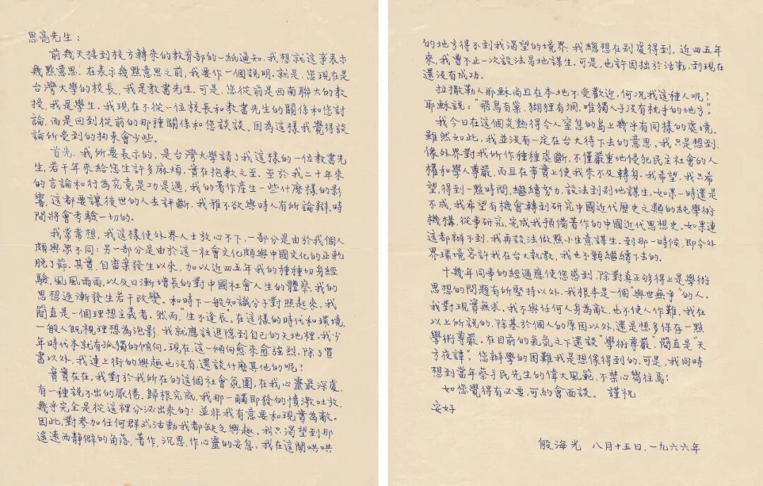 1966年作 致钱思亮信札