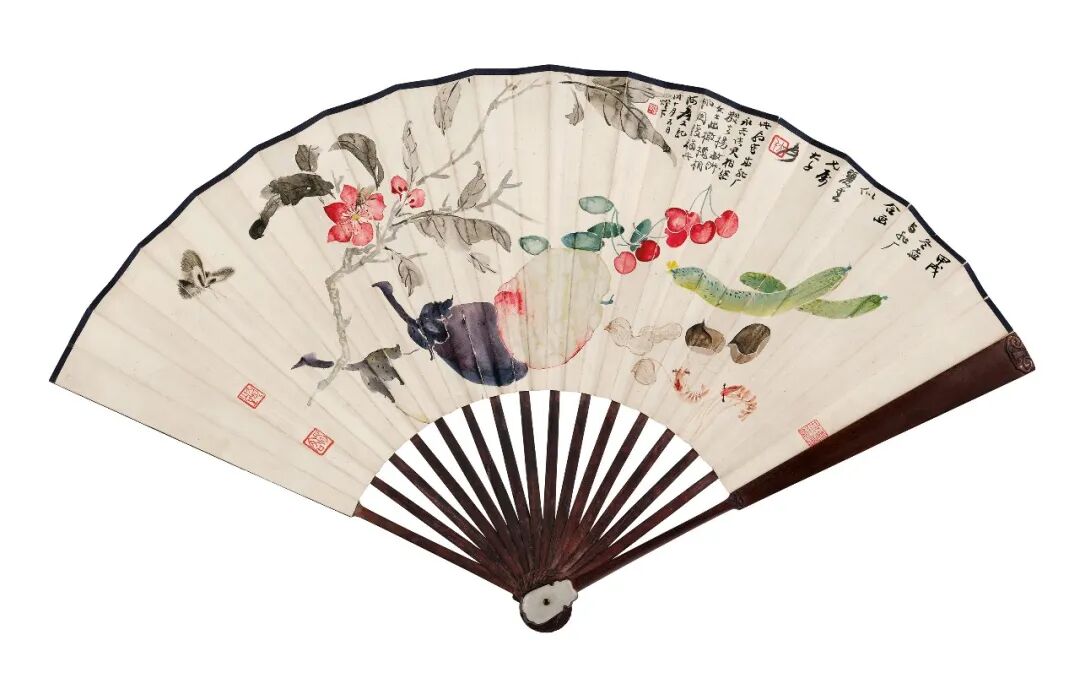1934年作 花果蔬蝶 行书七律 成扇