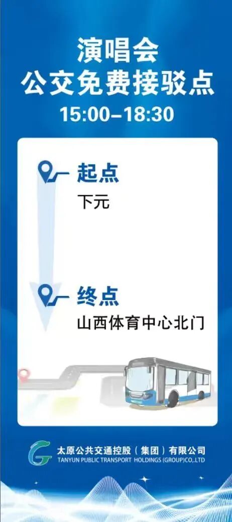 武宿机场至山西体育中心南门免费接驳专线。由机场大巴发车点发车,途经龙城大街、滨河西路、健康南街至山西体育中心南门。演唱会期间发车时间:15:30、16:30、17:30。