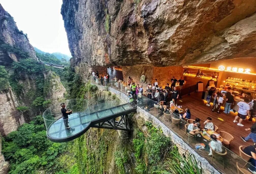 清晨,方洞景区的绝壁栈道上,海拔200多米的云端拾光悬崖咖啡馆准时亮起灯。第一杯咖啡的香气混着山岚升起,对面是云雾缠绕的群峰,脚下是散落的田园人家。不远处,连接方洞与灵岩的卧云栈道建于绝壁之上,漫步其间,云海在脚下翻涌,真有几分“飘飘乎如遗世独立”的恍惚感。