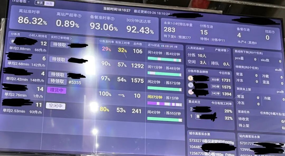 不过站长并不会独自承受这份焦虑与损失。站点里悬挂着一个大显示器,整个站点的准时率、30分钟送达率等数据都会呈现在大屏幕上,每个人的每一秒,似乎都被要求为这些数据负责。