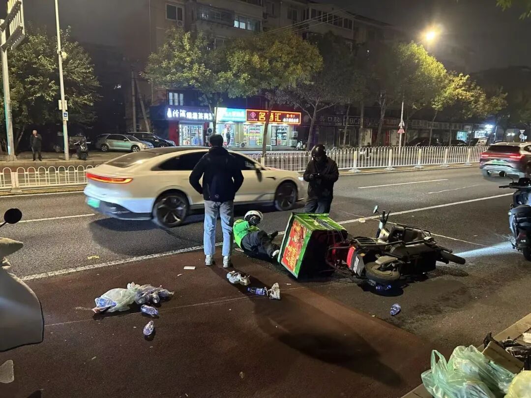 ◉2025年10月,北京,一名小象超市外卖员因为行驶速度过快,货物重量过大,紧急刹车之后仍然向前滑行了一段距离,与过马路的电动车相撞,配送的矿泉水散落了一地。图源:食通社