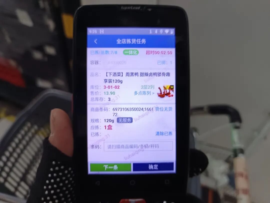 第二件,小米辣:中温,03-01-06-01。第六层是最高层,我够不着。货架高约一米八,最高层的商品通常放在塑料筐里,我伸手仅能摸到塑料筐的边缘。踩凳子是个好方法,但是找凳子、搬凳子、踩上去、拿商品、扫描、落地,这一系列操作花费的时间差不多要30秒,我不能让这一件商品就用掉六分之一的时间。