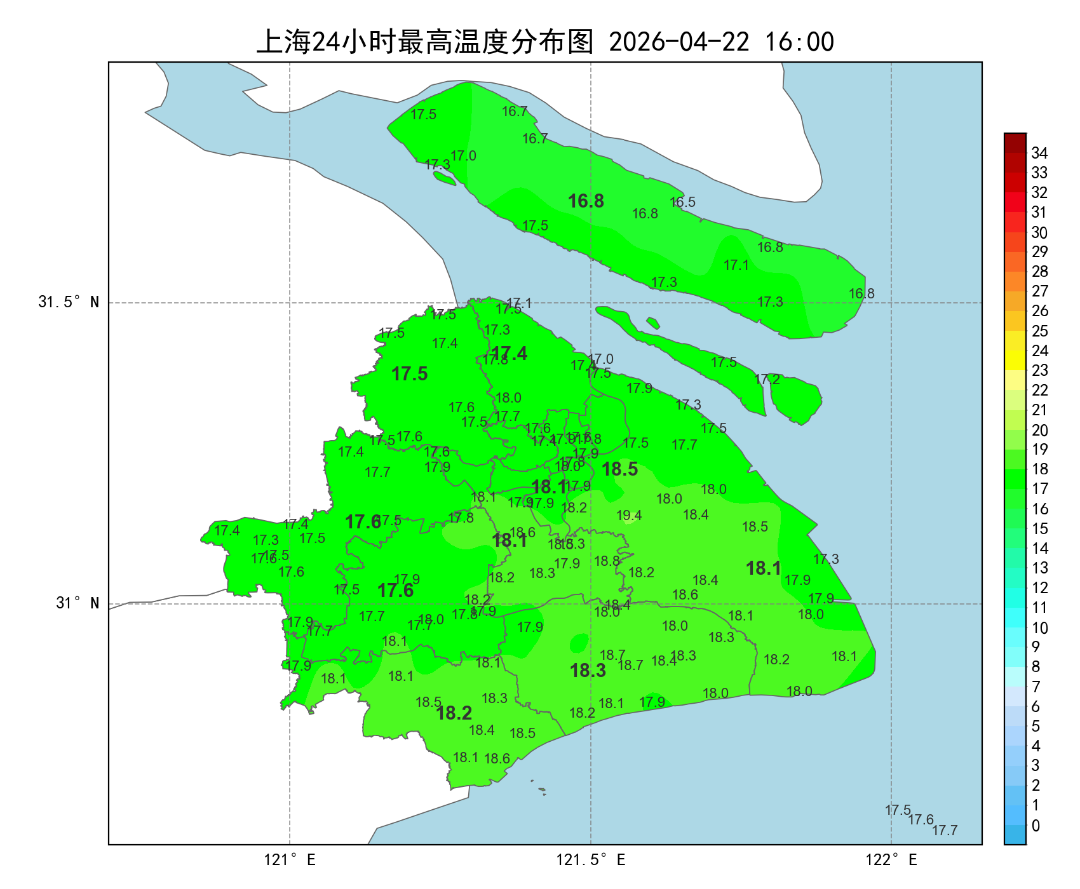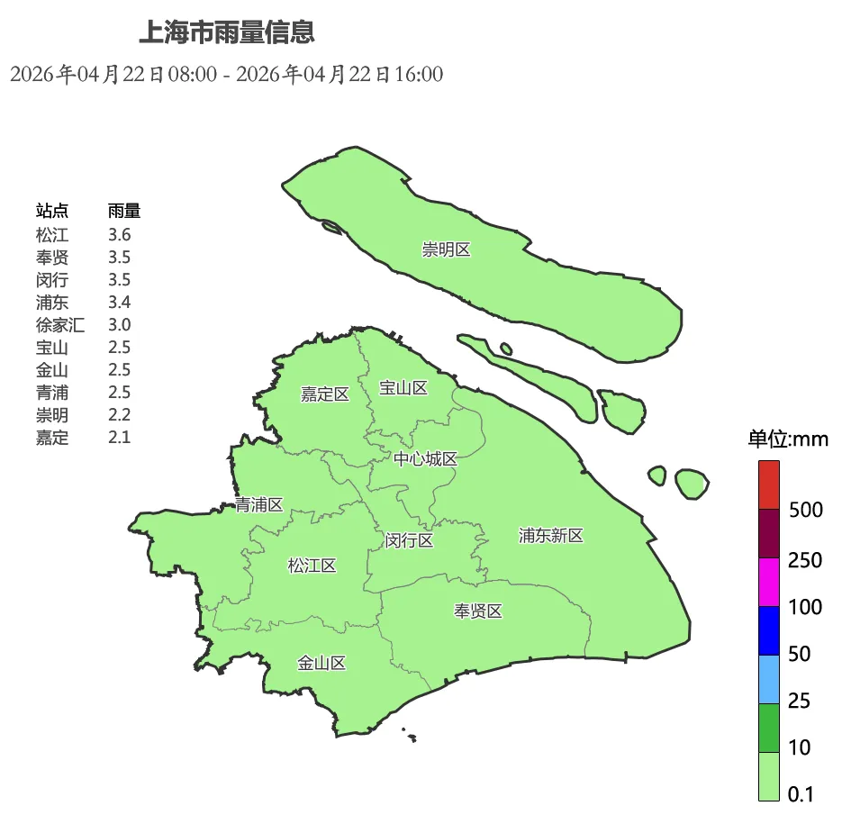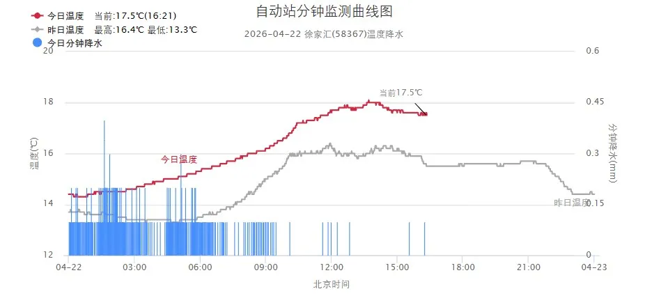 受切变线东移影响,申城昨夜普降中到大雨,今天白天雨势减弱。统计22日08时~16时显示,全市累积雨量为小雨量级。雨水影响下,今天最高气温多在17、18度附近,市区徐家汇站18.1度,加之风力不小,白天体感有点凉飕飕。
