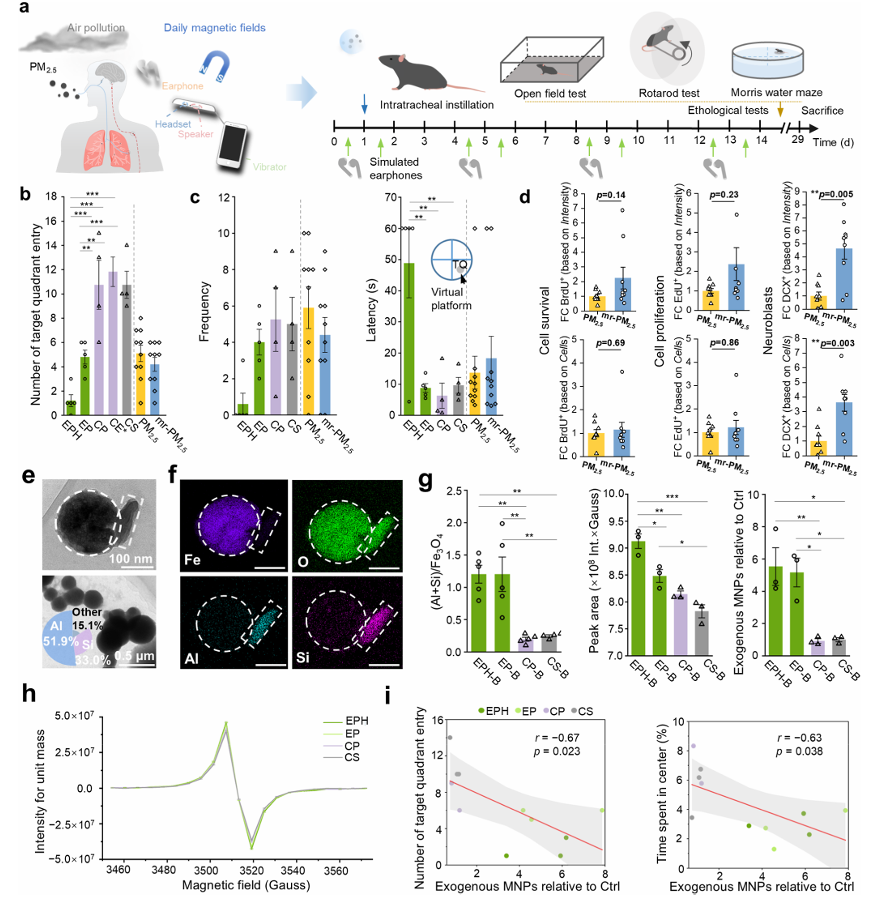 脑内颗粒积累暴增约5倍:在耳机/手机磁场(EEM)暴露下,吸入的磁铁矿纳米颗粒在脑内的积累量较无磁场对照组增加了约5倍(p<0.001)。电子顺磁共振(EPR)与质谱分析均证实,这些颗粒具有外源性特征(含铝、硅等伴生元素),确来自环境污染物。