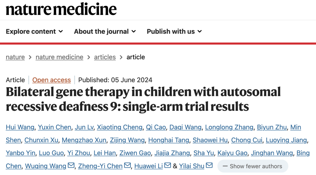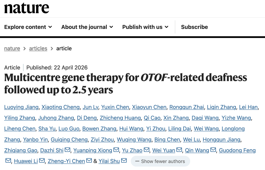 2026 年 4 月 22 日,复旦大学附属眼耳鼻喉科医院舒易来教授领衔,哈佛大学医学院 Zheng-Yi Chen 教授、复旦大学附属眼耳鼻喉科医院李华伟教授、北京协和医院冯国栋教授、中南大学湘雅二院汪芹教授、重庆市人民医院袁伟教授、四川大学华西医院赵宇教授、南昌大学第一附属医院熊园平教授、南华大学附属第二医院石大志教授作为共同通讯作者(复旦大学附属眼耳鼻喉科医院蒋罗颖、程晓婷、吕俊、陈玉鑫、陈小蕴,郑州大学第一附属医院翟荣群,北京协和医院张立芹作为共同第一作者),在国际顶尖医学期刊 Nature 上发表了题为:Multicentre gene therapy for OTOF-related deafness followed up to 2.5 years 的研究论文【1】。