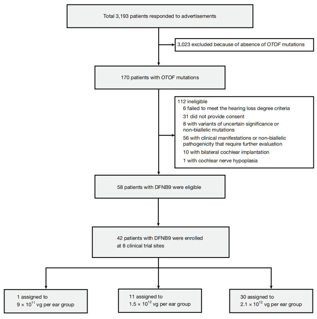 这项在全国 8 家三甲医院(复旦大学附属眼耳鼻喉科医院、北京协和医院、四川大学华西医院、中南大学湘雅二医院、重庆市人民医院、南昌大学第一附属医院、郑州大学第一附属医院、南华大学附属第二医院)共同开展的多中心临床试验,共纳入了 42 名年龄在 9 个月至 32 岁的 OTOF 基因突变的 DFNB9 型耳聋患者,覆盖婴幼儿、儿童、青少年与成年人,是该领域年龄跨度最广的研究。该临床研究的随访时间最长达 2.5 年。患者被分为三个剂量组,接受了单耳或双耳注射。