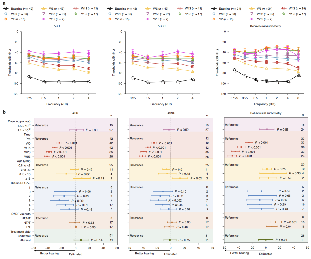 这项针对 OTOF 基因突变导致的 DFNB9 型耳聋患者的 AAV 基因治疗研究,发布了长达 2.5 年的结果,90% 的患者在基因治疗后成功恢复听力,并且听力水平呈现持续、稳定的提升趋势,该研究还首次完整揭示了患者在基因治疗后的听力、言语改善的长期规律。