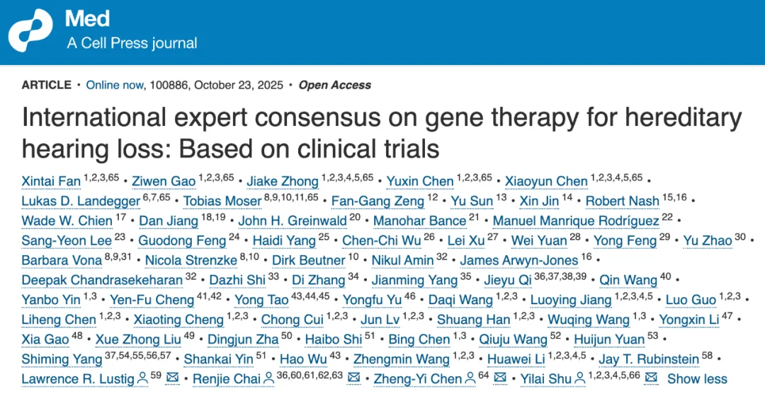 值得一提的是,舒易来教授团队牵头,联合包括中国、西班牙、英国、美国、韩国和德国等国家的 46 位耳科学、遗传学、听力学、基因治疗及听觉康复等多学科领域专家,共同制定了全球首个先天性耳聋基因治疗国际专家共识,为推动基因治疗领域的全球标准化发展提供规范框架。该共识于 2025 年发表于 Cell 子刊 Med【4】。